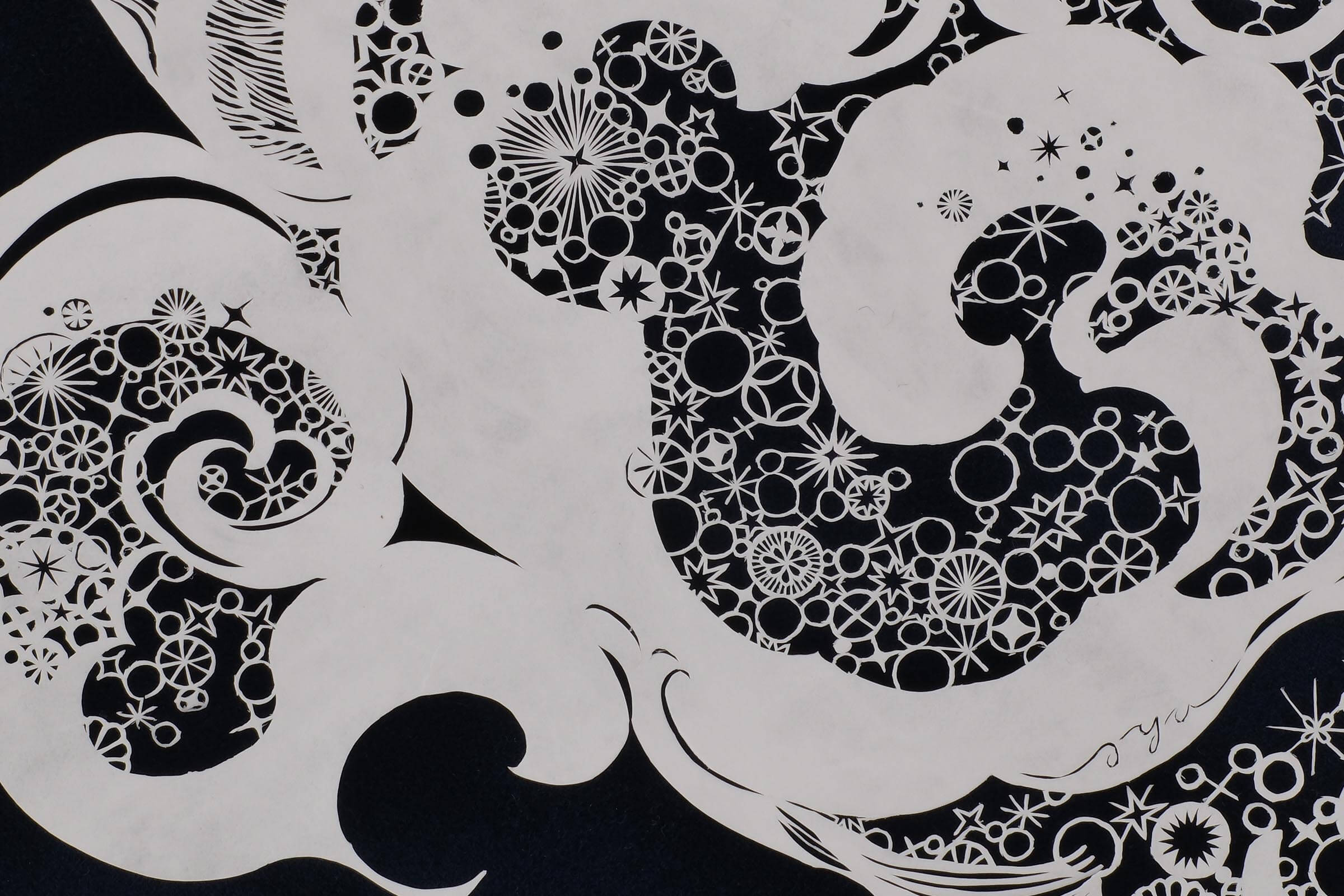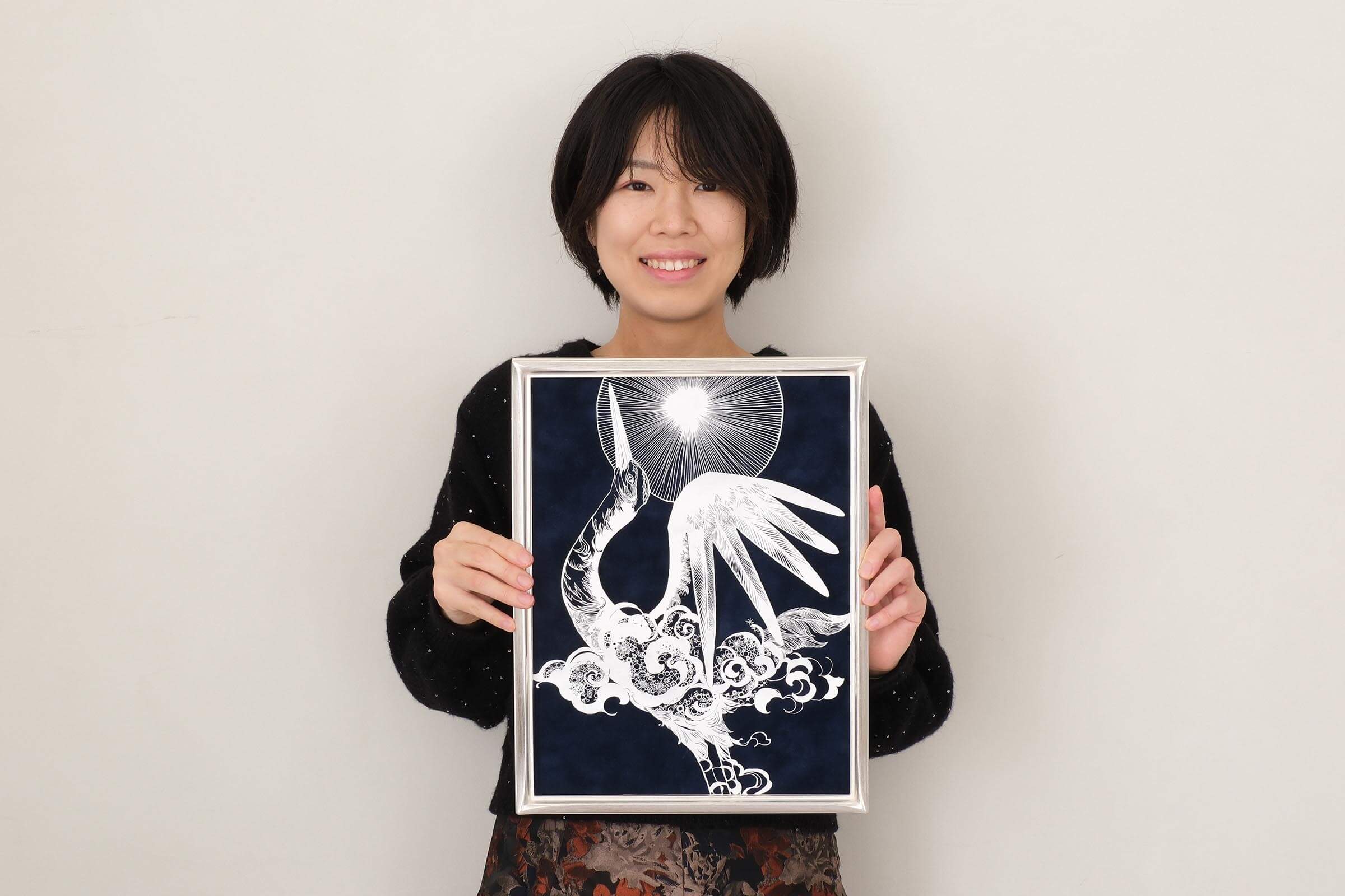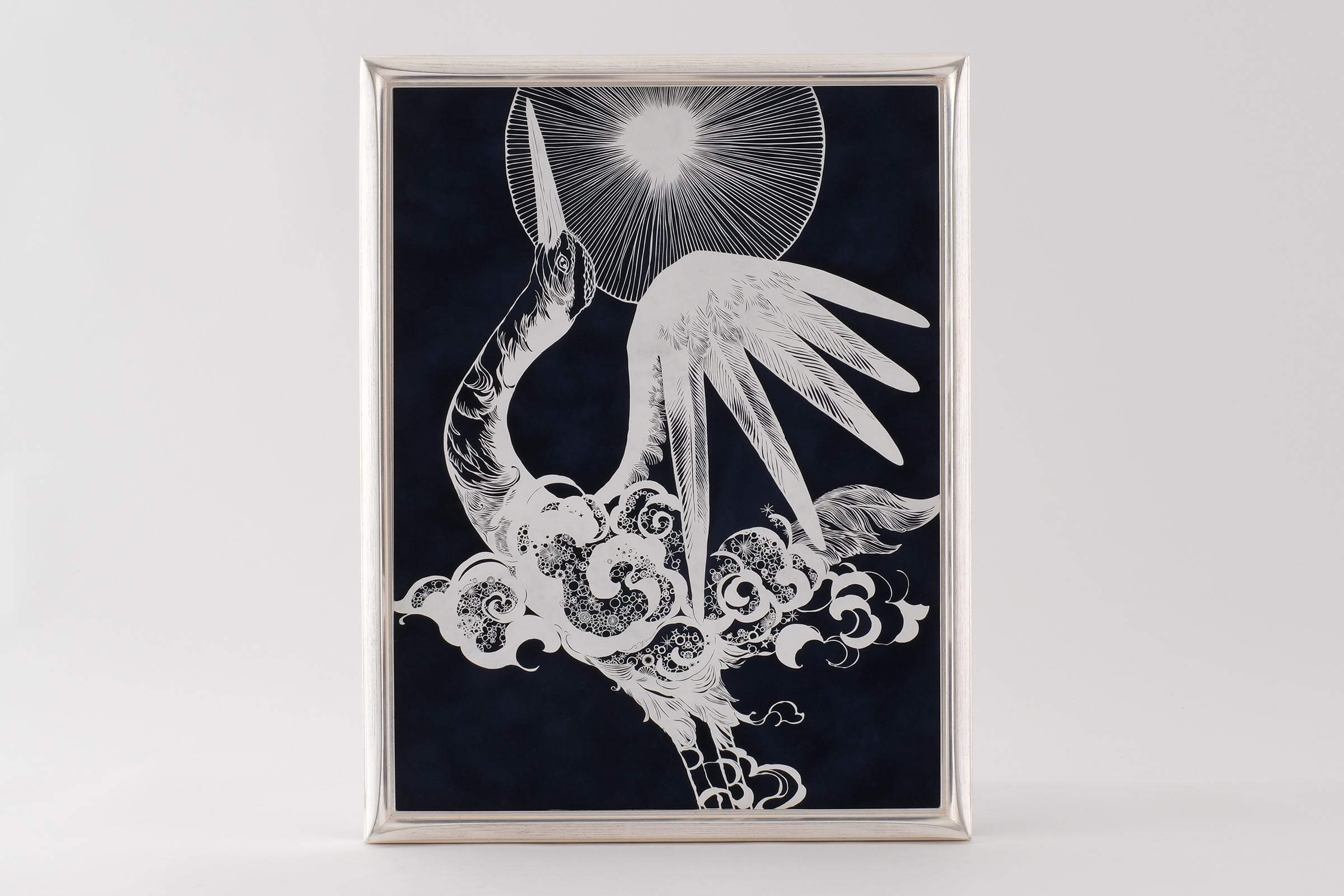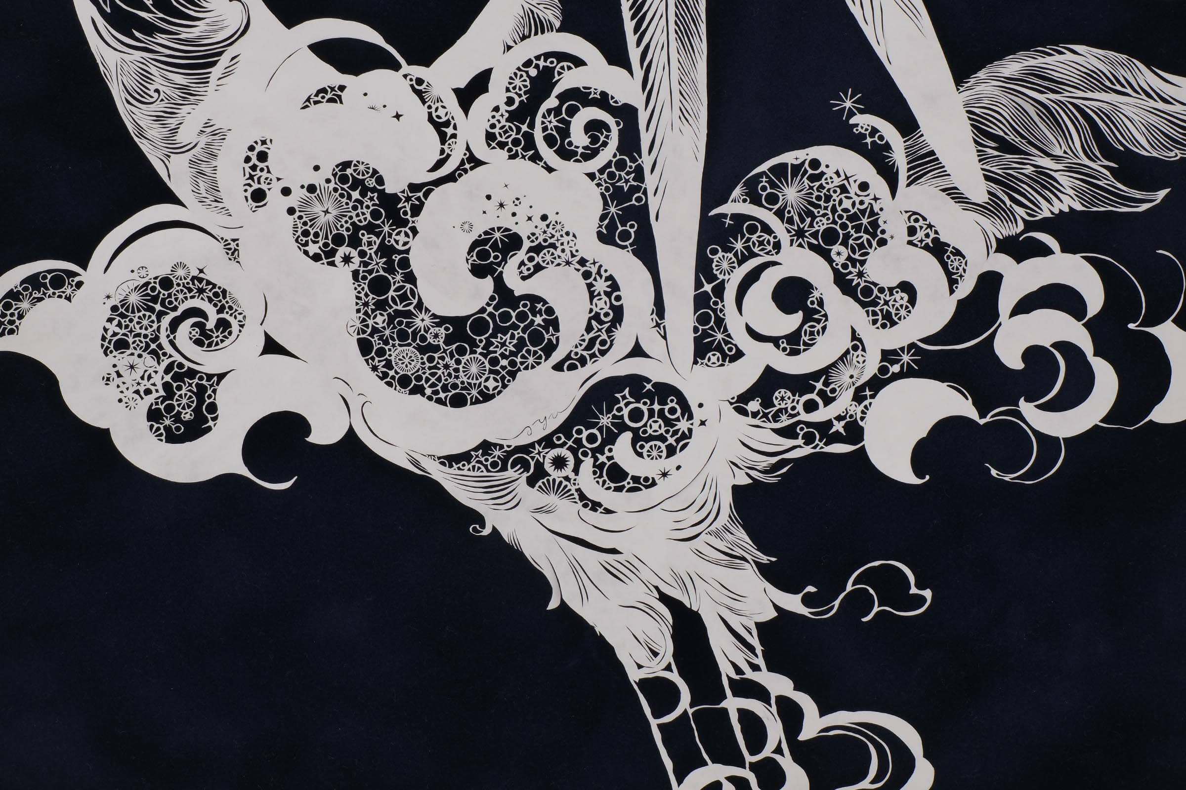 晴れやかな気分になるものが良いと思い、天が晴れて鶴が舞うイメージをストレートに表現しました。切り絵は線のメリハリがつきやすいですが、グラデーションで見えるように意識しました。最近は雲のイメージを切り絵に取り入れています。離れると全体の陰影の表現が見えて、近づくと細かい模様が見えます。作品との距離で印象が変わるところを楽しんでもらえたらと思います。