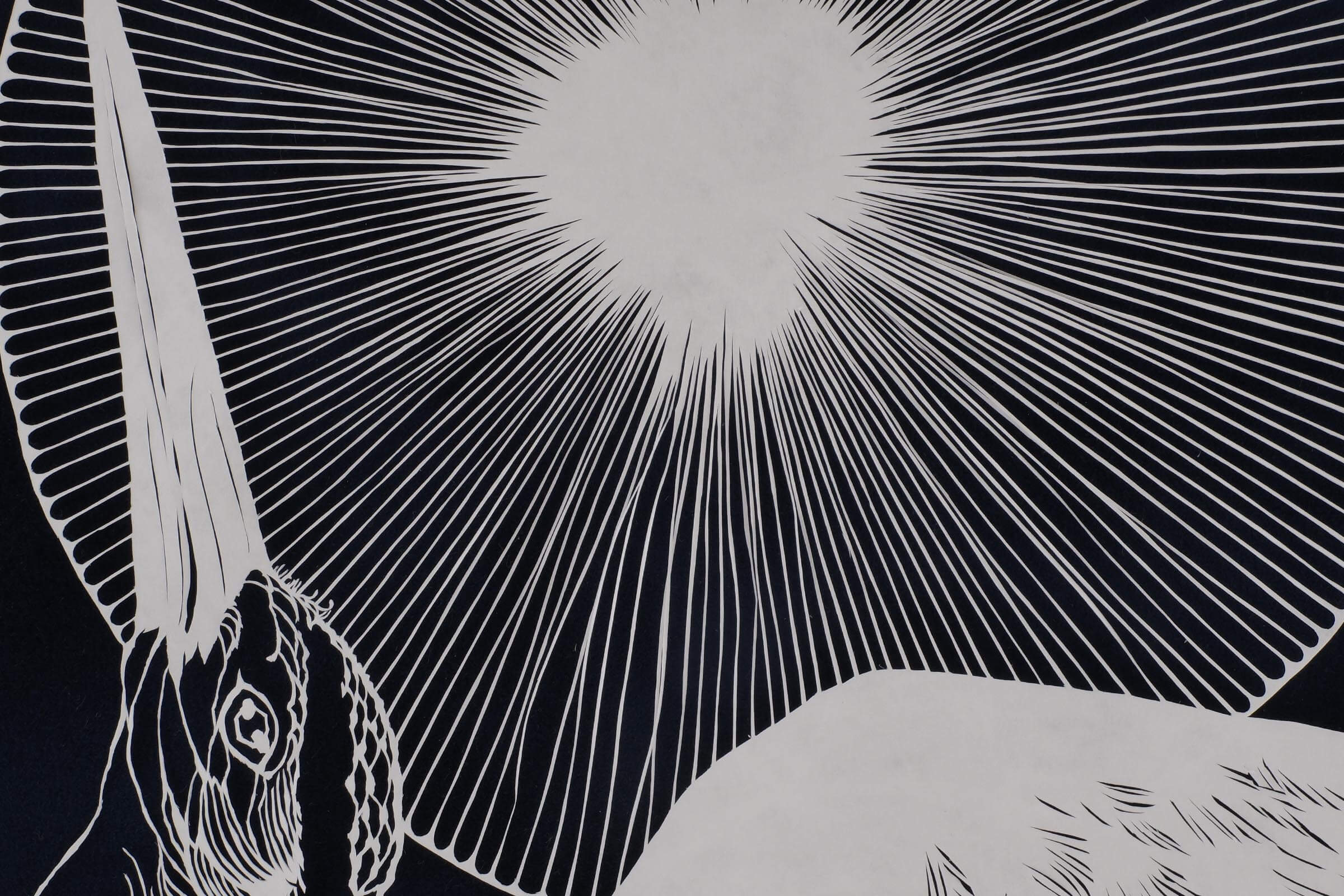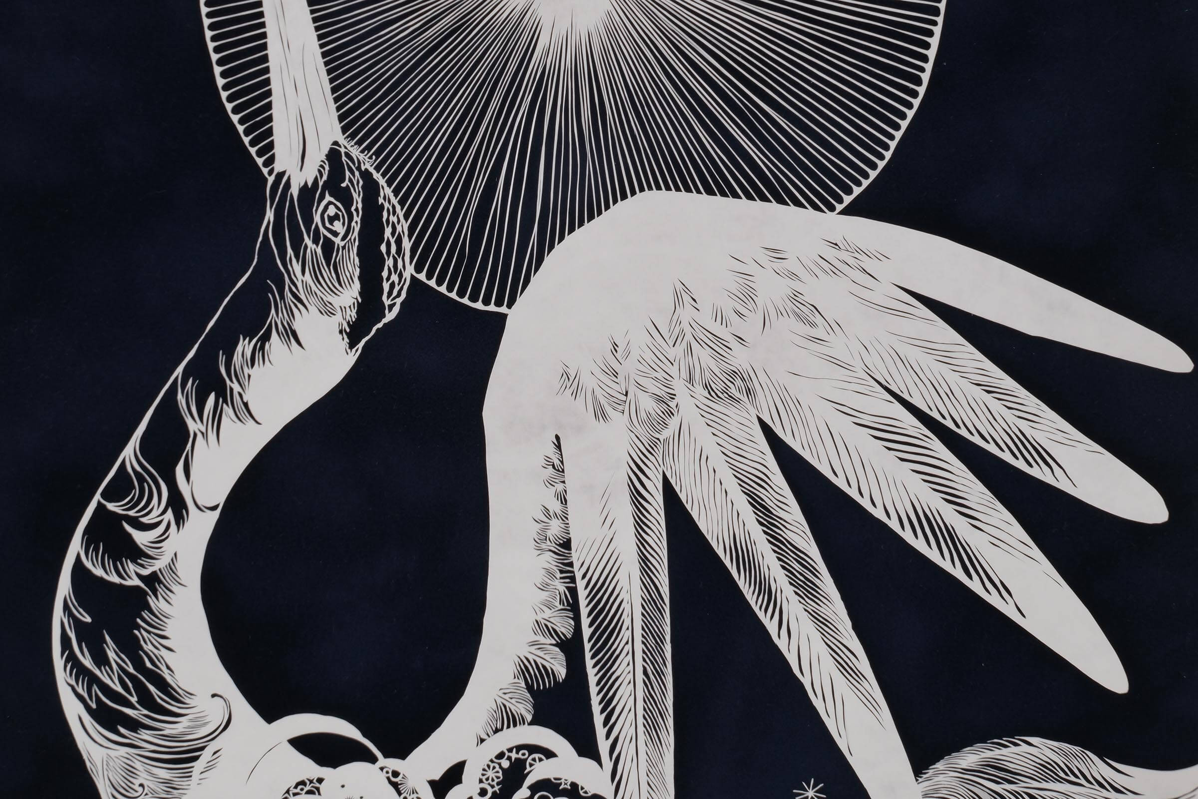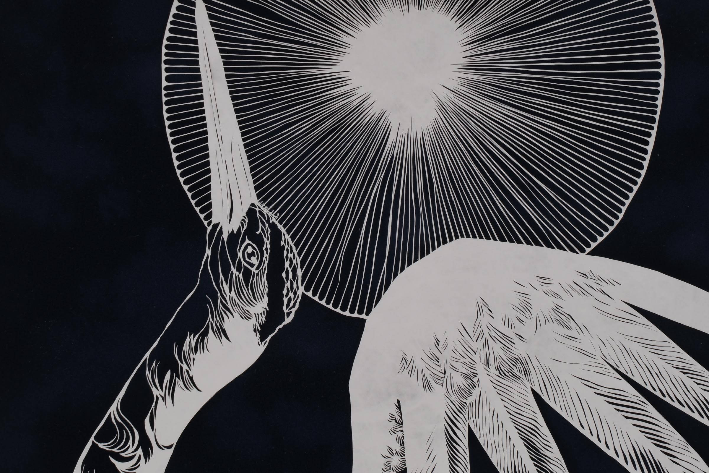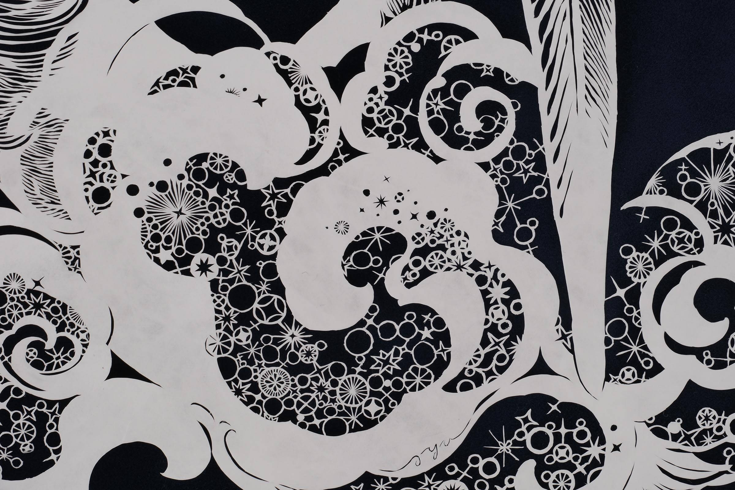 晴れやかな気分になるものが良いと思い、天が晴れて鶴が舞うイメージをストレートに表現しました。切り絵は線のメリハリがつきやすいですが、グラデーションで見えるように意識しました。最近は雲のイメージを切り絵に取り入れています。離れると全体の陰影の表現が見えて、近づくと細かい模様が見えます。作品との距離で印象が変わるところを楽しんでもらえたらと思います。