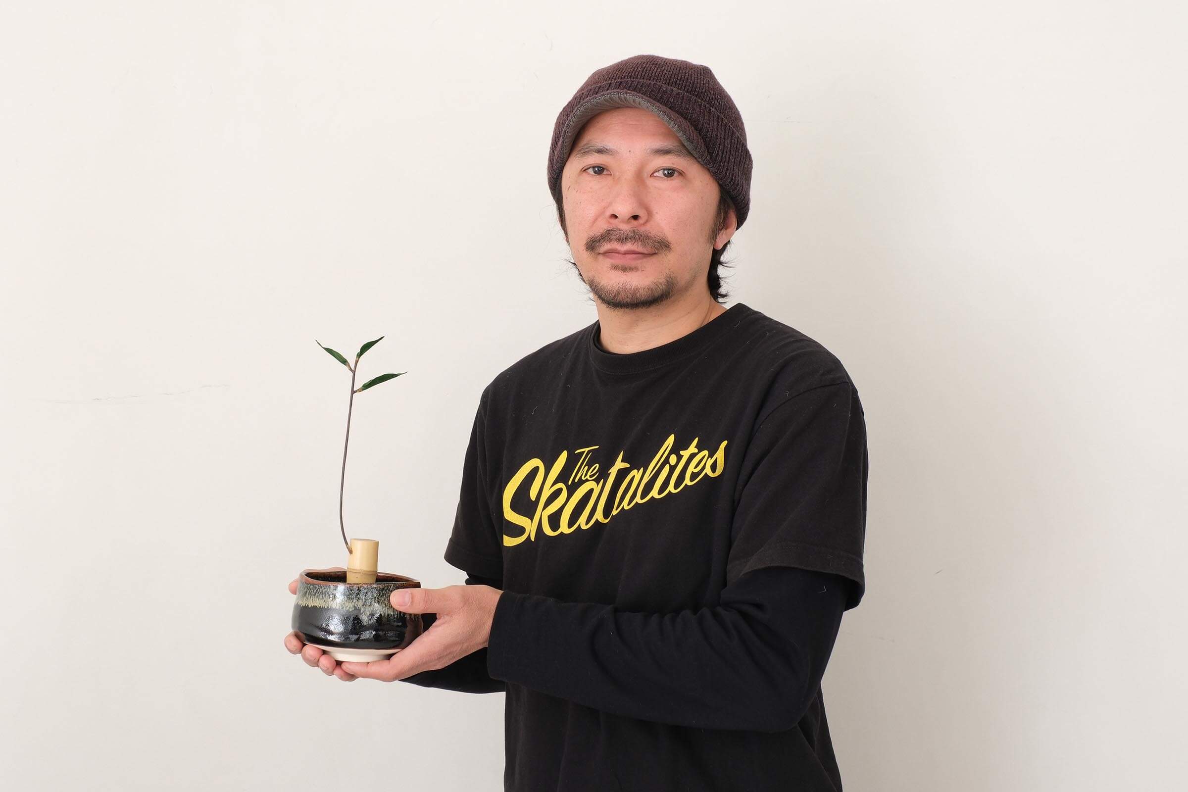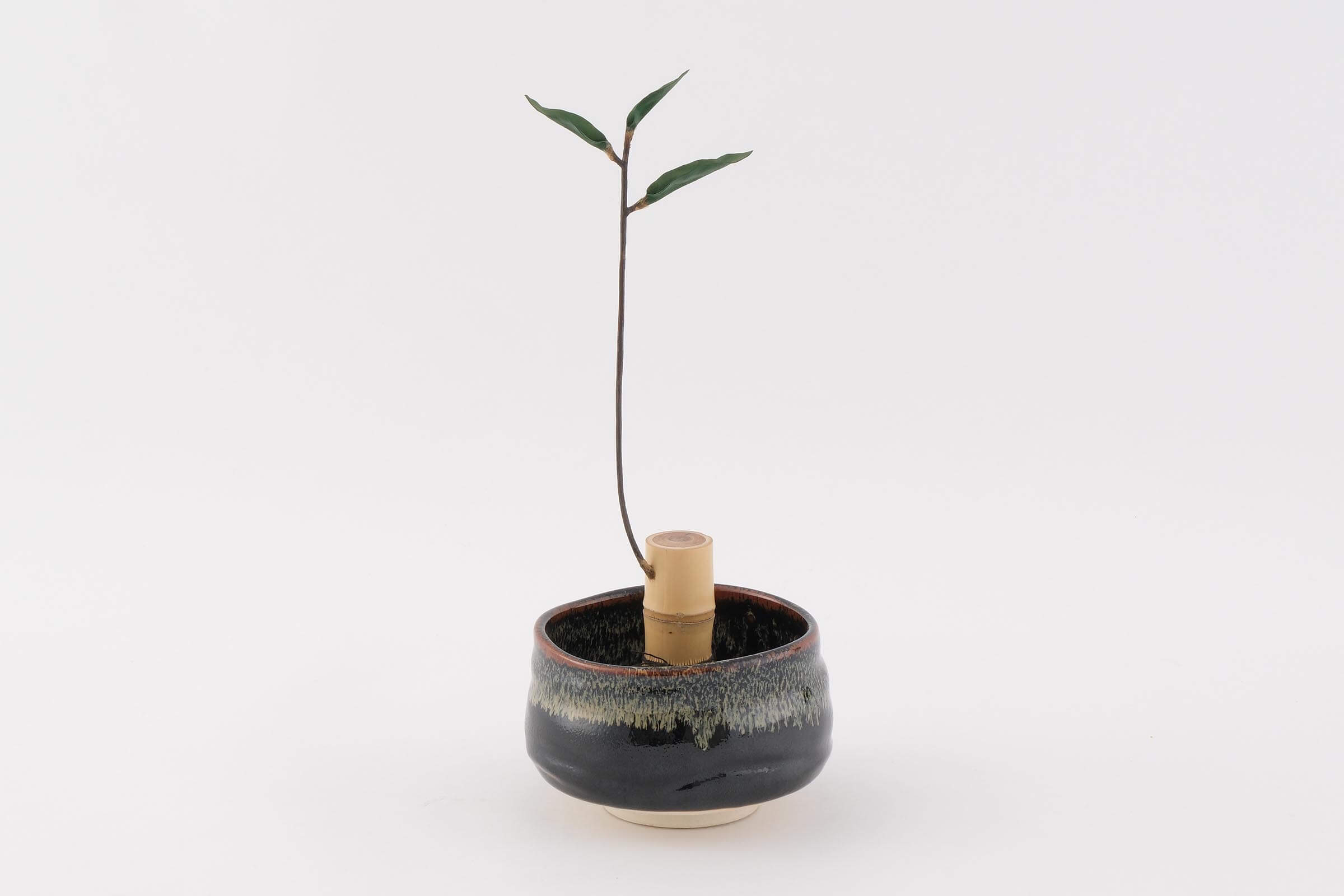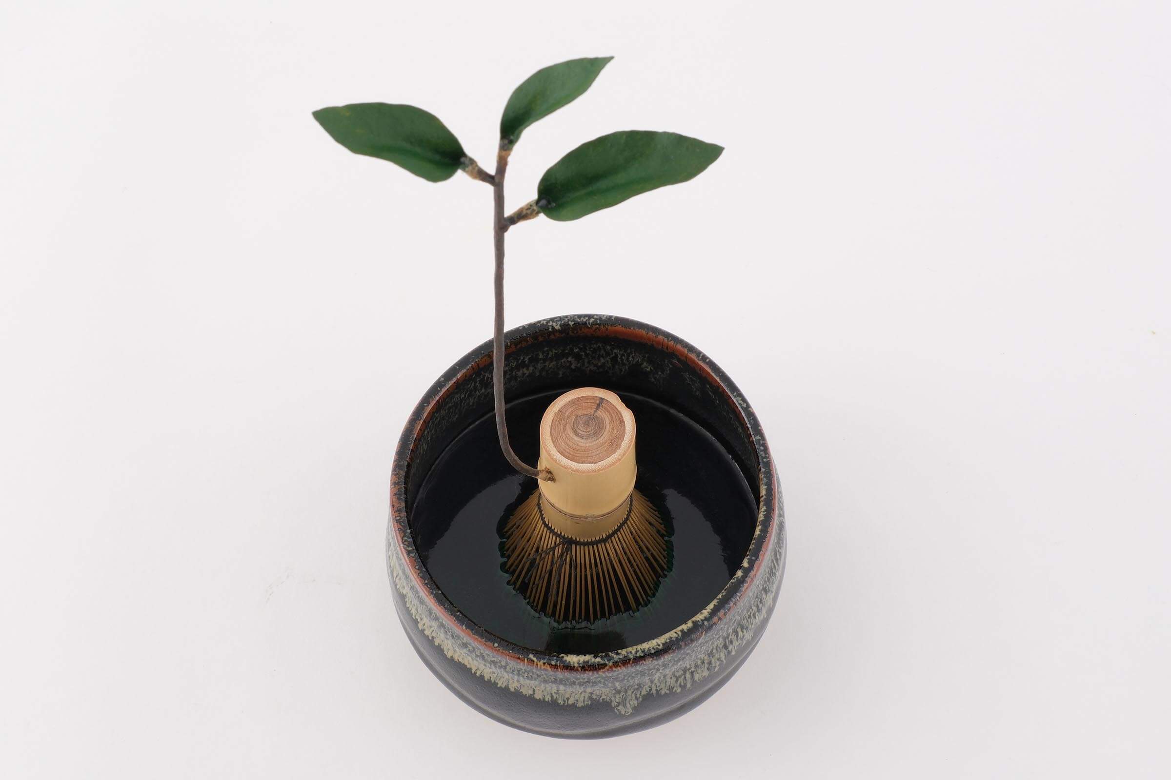 「めちゃくちゃ」に作品を作るのは難しいので、ありそうだけど不自然よく考えると「めちゃくちゃ」なものを考えました。漢字で書くと滅茶苦茶と“茶”があるので茶道をテーマにしつつも「めちゃくちゃ」なので、華道も織り交ぜました。茶筅から生えるのはお茶の芽で一芯二葉の状態は新茶の摘み時です。作法はちゃんとしていますが辻褄が合わない。さもこういうものがある風な作品です。もし、お茶会でこれが出てきたら……なんて空想を膨らませながら作品を見てもらえると嬉しいですね。