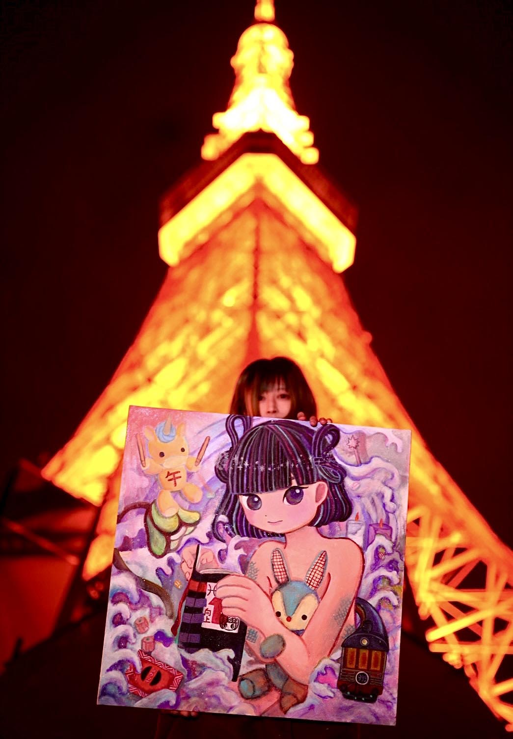最初の「おまちどうさま」のイメージはお弁当屋さんでした。そこからいろいろと考え、新しい未来の自分がやってきて「おまちどうさま」という絵を描こうと思いました。最近は日本の歴史に興味があり、背景は葛飾北斎の波のイメージです。そのなかにいる女の子は私で、脳内にあったいろんなモチーフを組み合わせてファンタジー感を表現しました。私はずっとお面を被った女の子を描いてきましたが、それを外した作品では、私が子供の頃に好きだったアニメや映画の要素を取り入れたいと思っています。