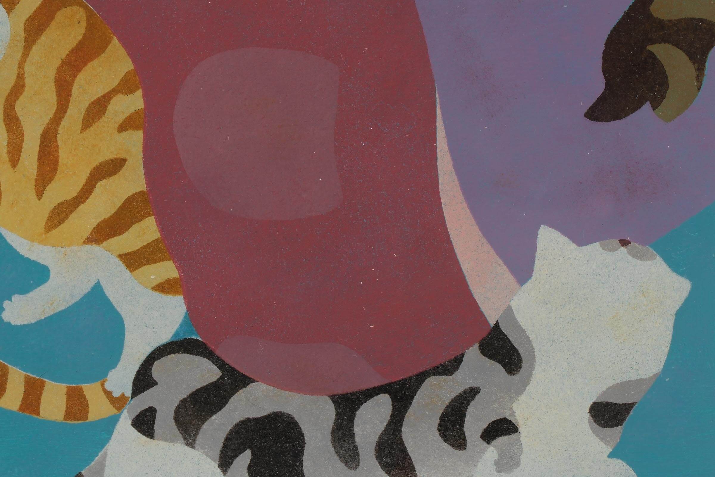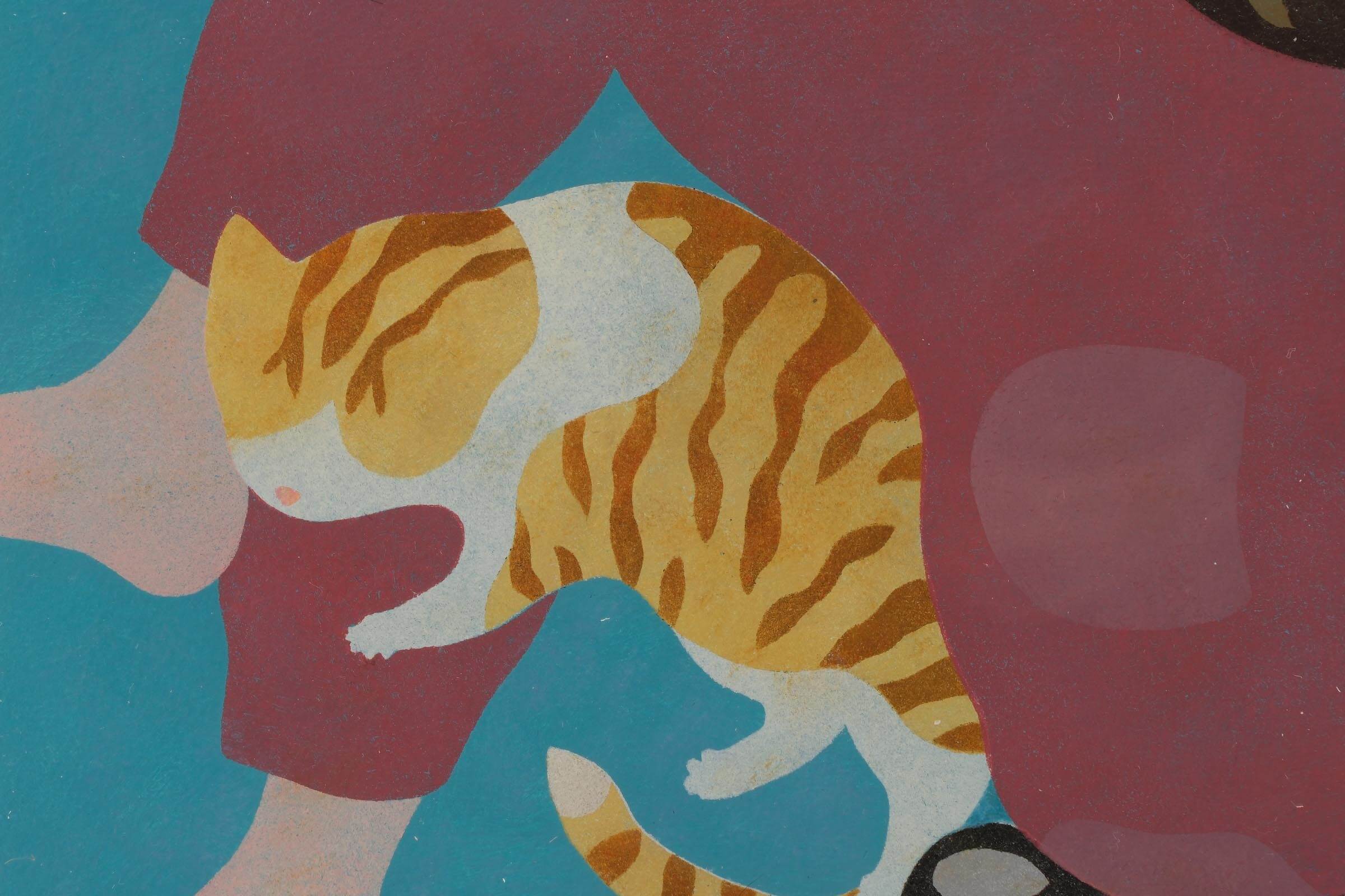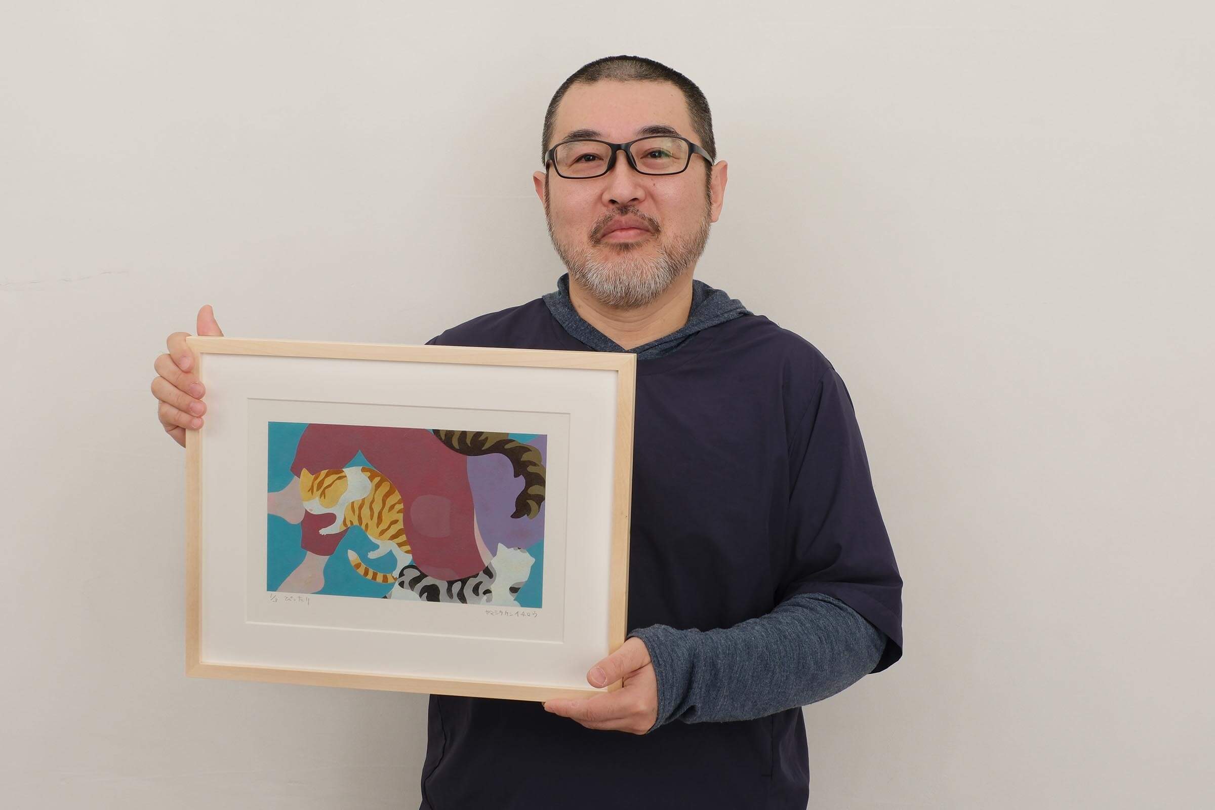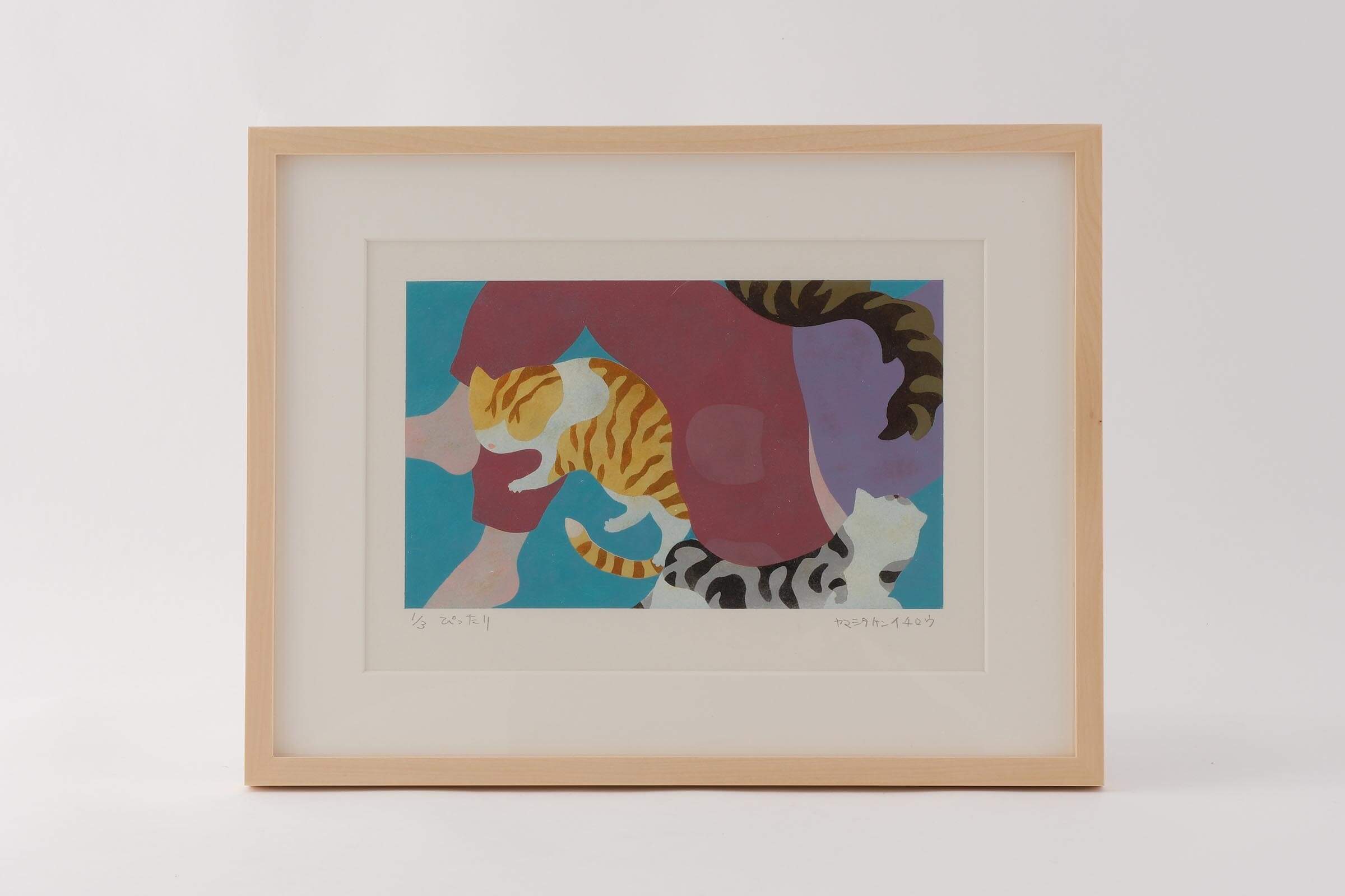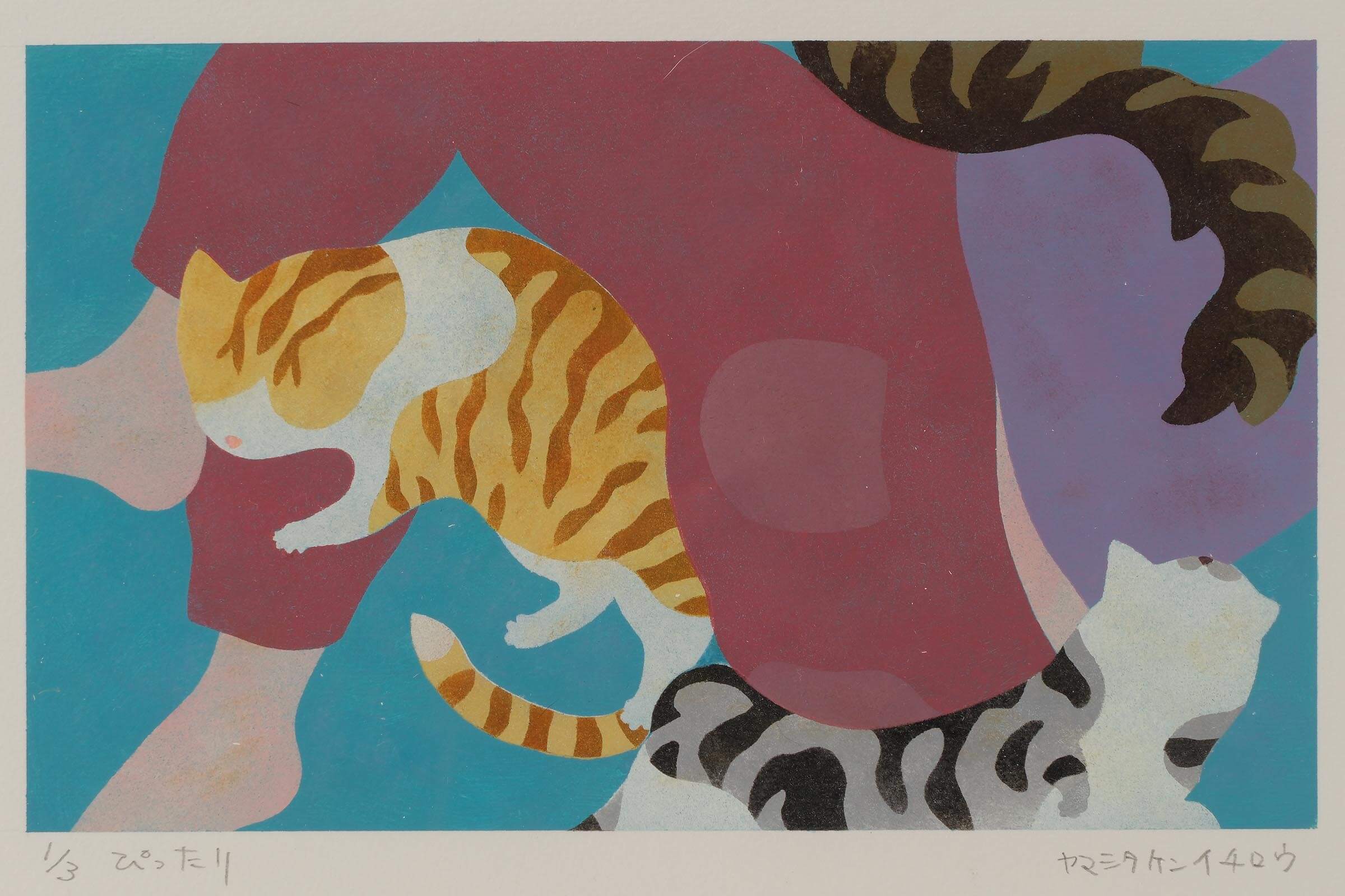 「ぴったり」をそのまま描きました。“ぴったりフィットする”などと使われることもあり、“くっつく”という視覚的なイメージを強く含んだ言葉だと思いました。それもあって、私にとっての日常である“人と猫がぴったりとくっついて寝ている姿”をモチーフに選びました。ステンシルで作っていますが、版画として情報量を削ったときの画面の構成と色合いの綺麗さを見てもらえたらと思います。