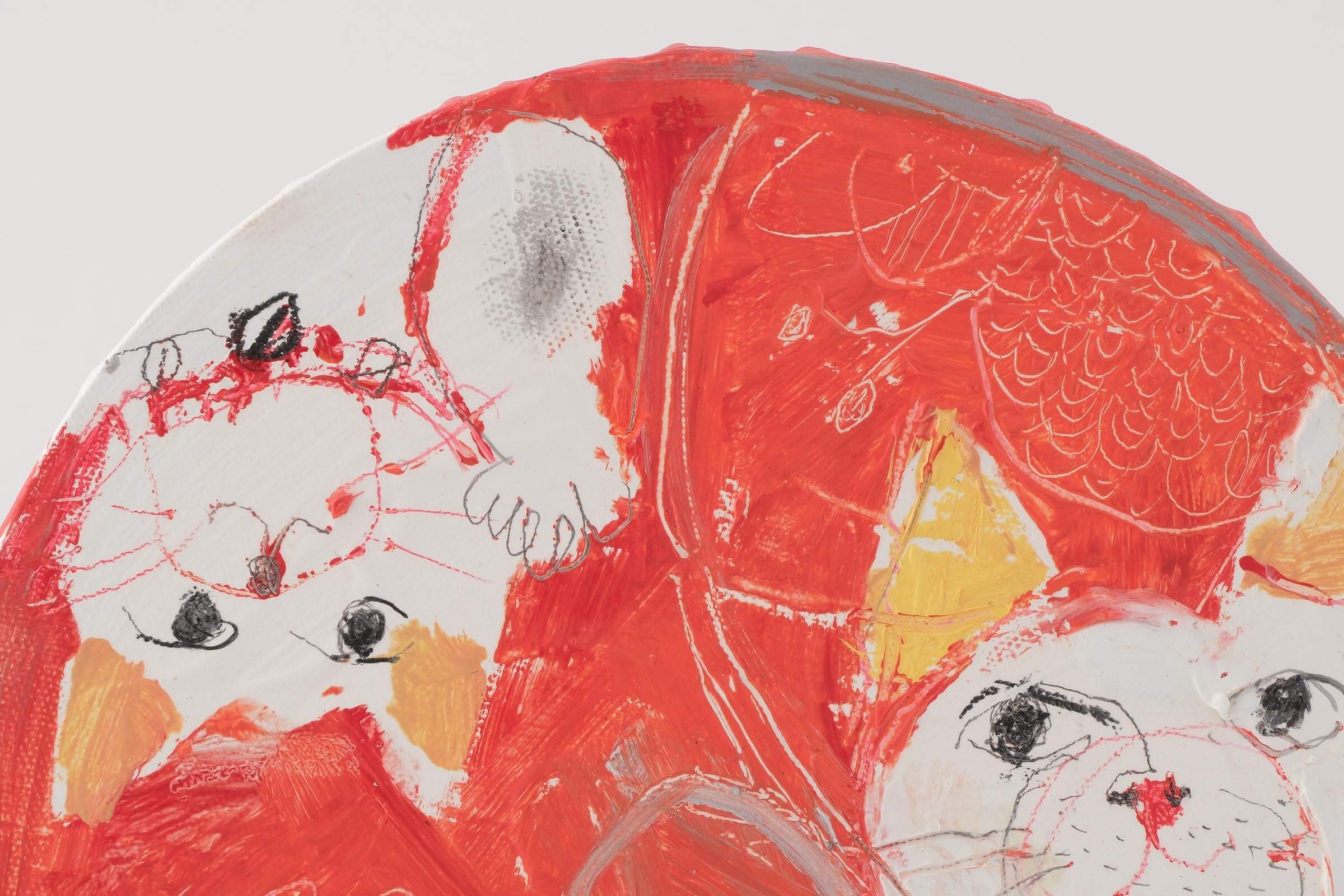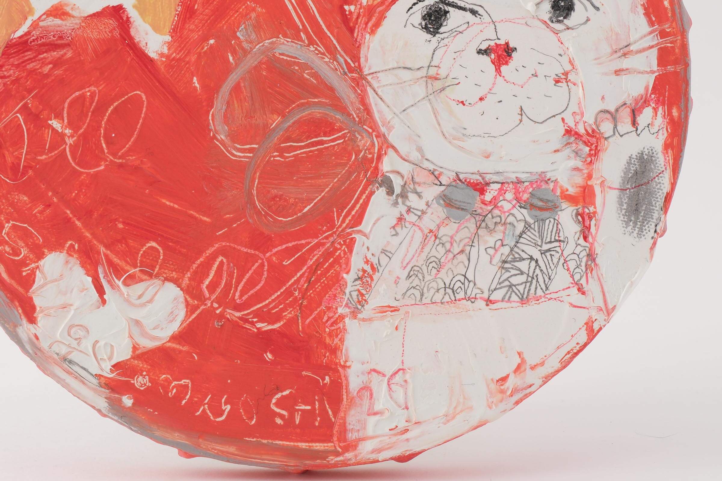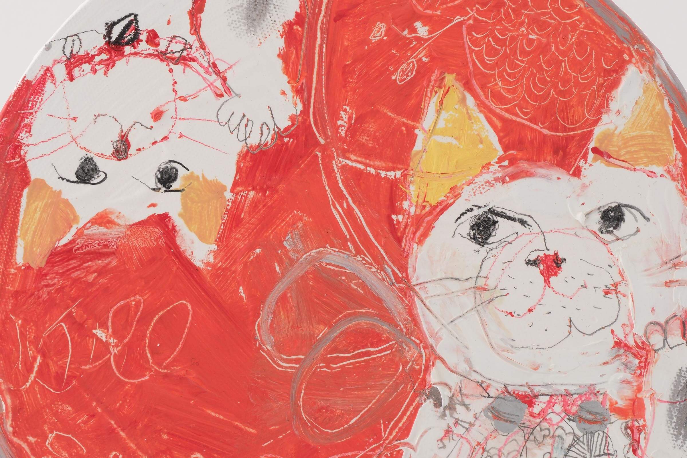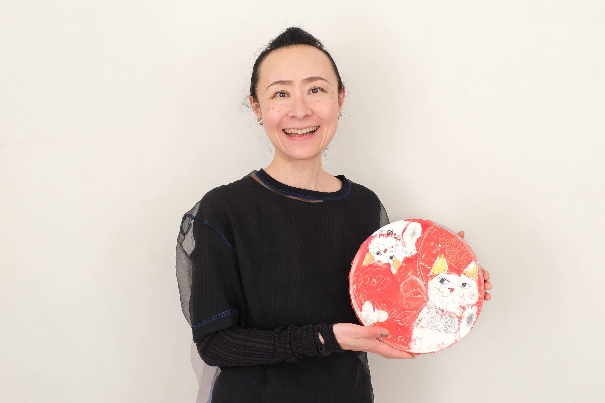 「おかげさま」から思い付いたのが、家の近所の仏具店にある招き猫でした。もともとはペアでしたが空襲でひとつが無くなってしまい、もうひとつが今でも残っていて、いろんな御利益があると言われています。そのなかで人と人をむすぶというご利益があり、私自身もいろんな人をつなげてもらった体験があり、私にとっての「おかげさま」はこの招き猫のイメージでした。作品では現存する猫を大きめに、いなくなってしまった猫を少し小さめに描きました。円形なのでどちら向きに飾ってもらっても良いと思っています。