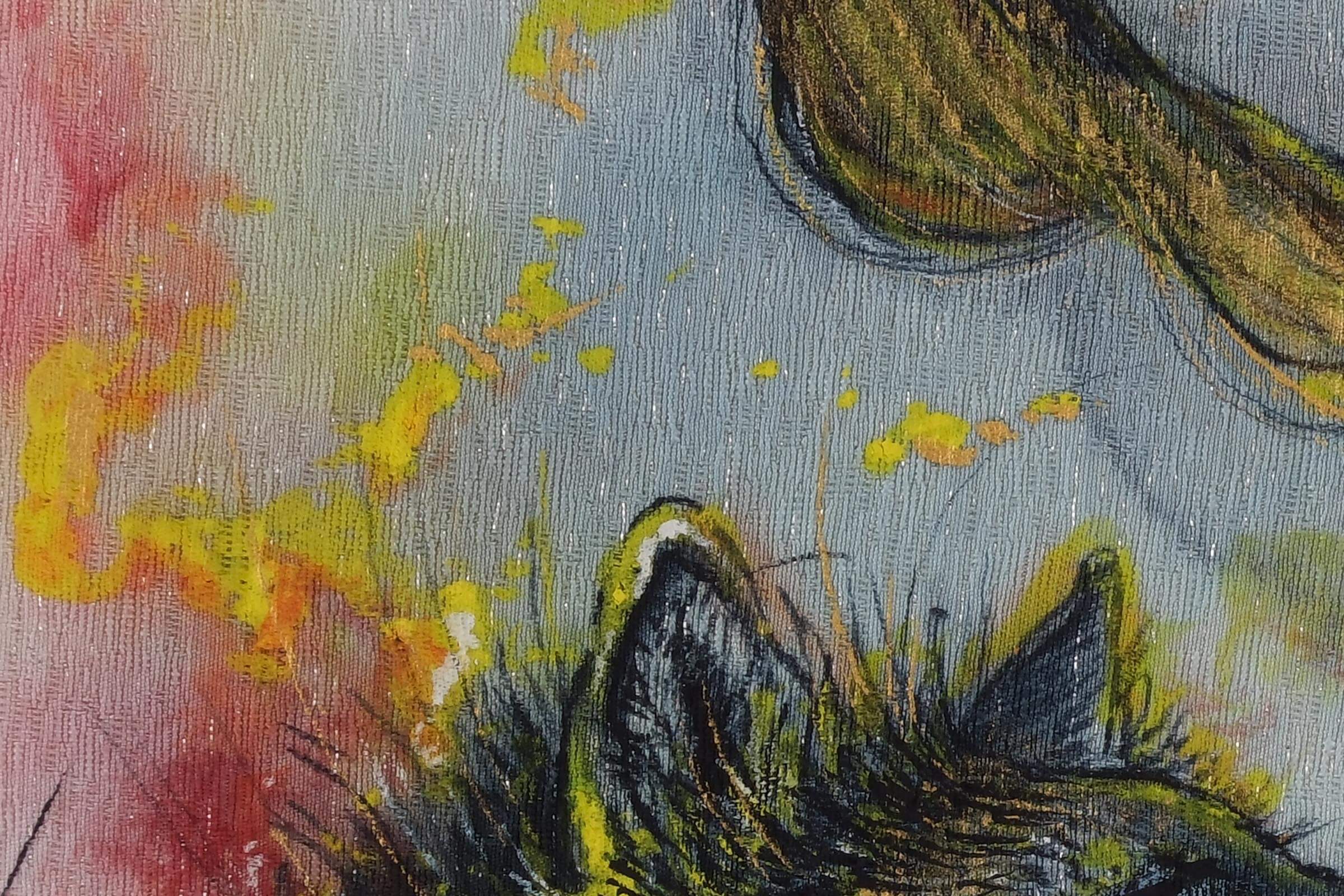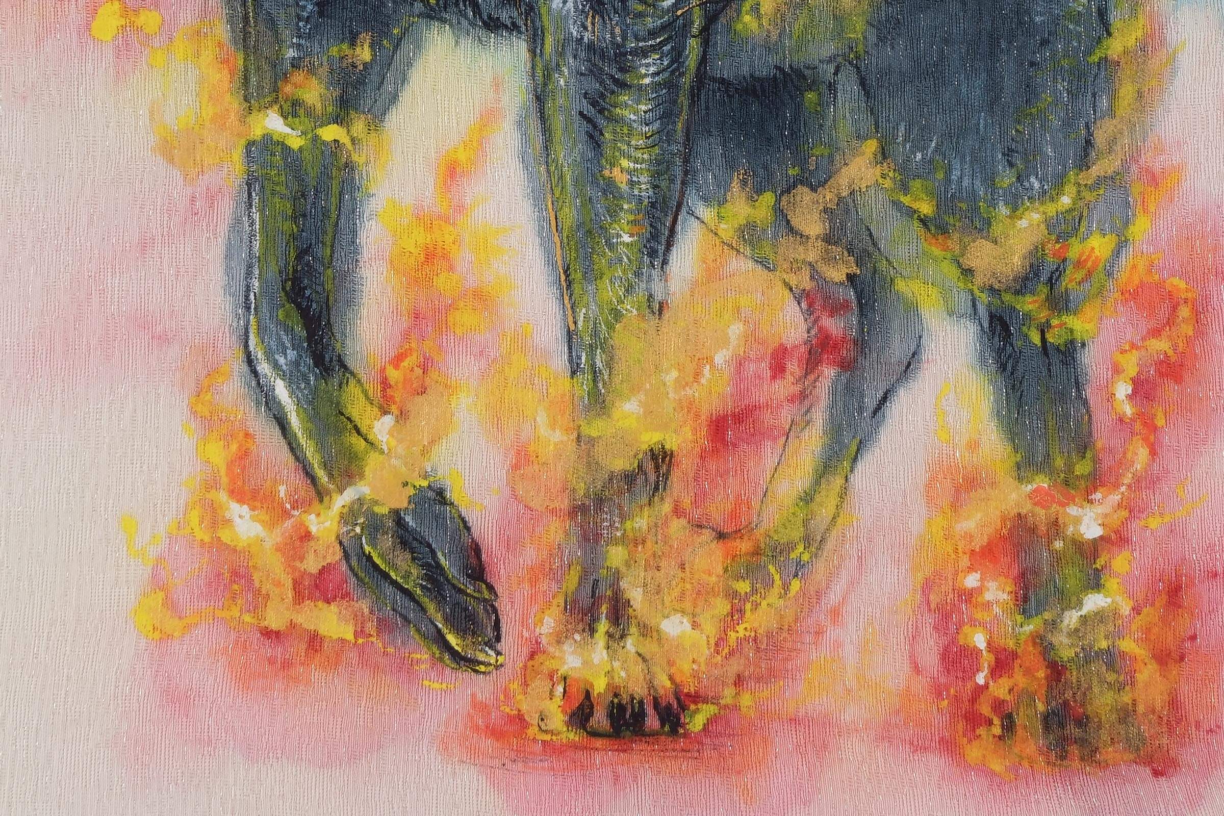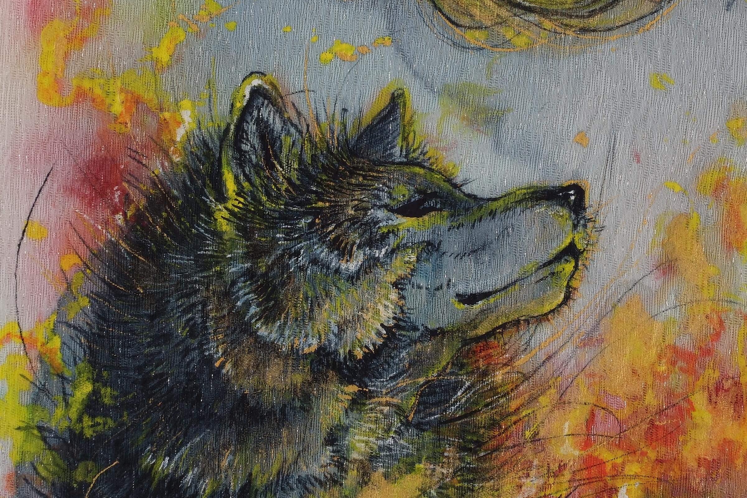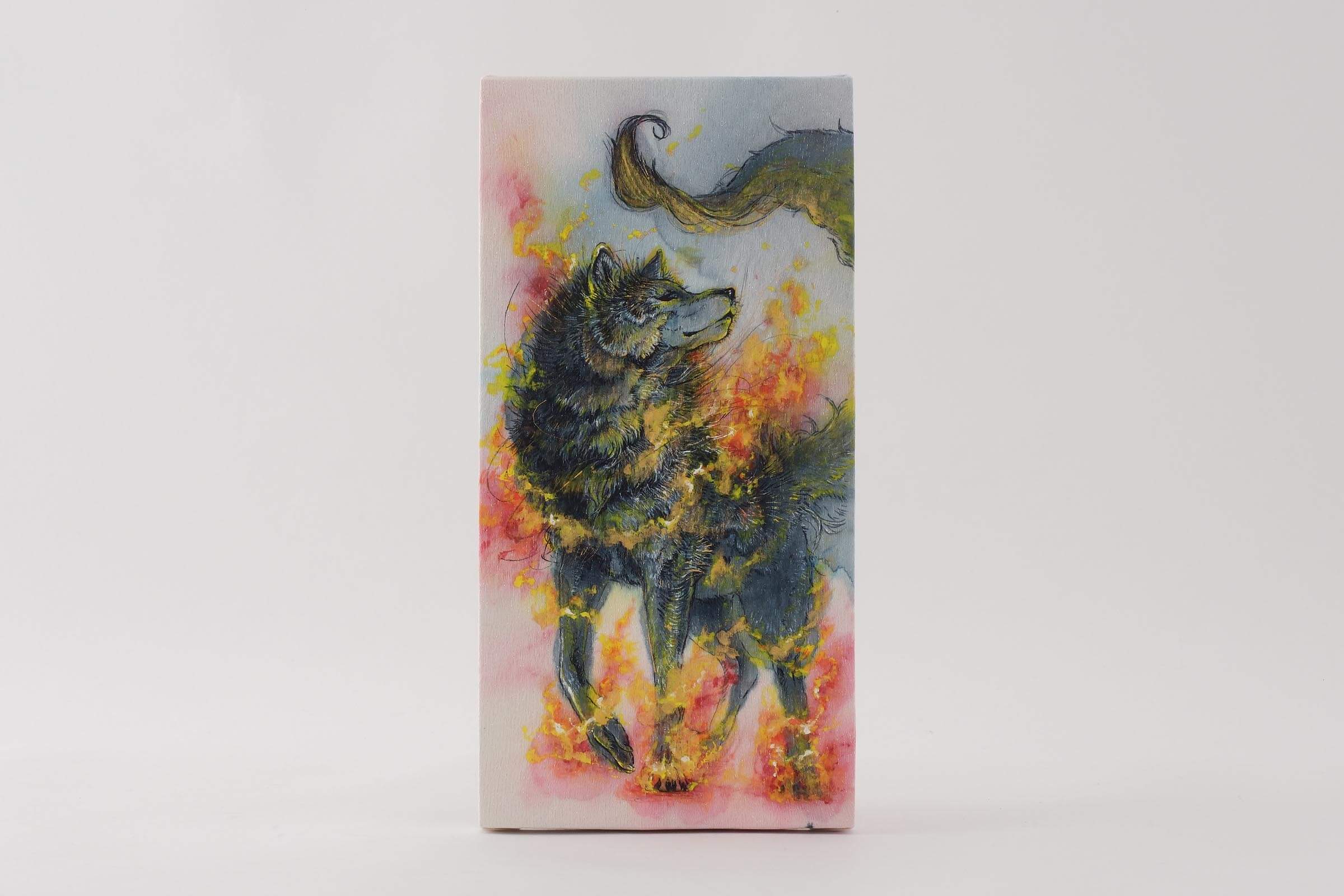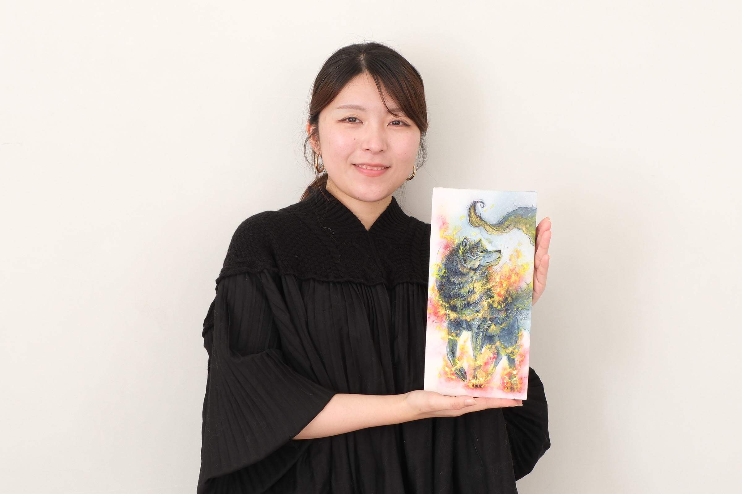 「おてんとうさま」は日本の“日出ずる国”のイメージで、私が普段から描いている狼と太陽を組み合わせて、“狼信仰”のモチーフを描こうと思いました。ぱっと見て狼と分かり、かつ炎の勢いを感じられるように煽り見る画角で描きました。狼は夜のイメージが強く、いつもは青系の色を使いますが、はじめて黄色や赤で表現しました。布地には銀糸が織り込まれていて光りが当たると輝くので、そのあたりも見て楽しんでもらえたらと思います。
