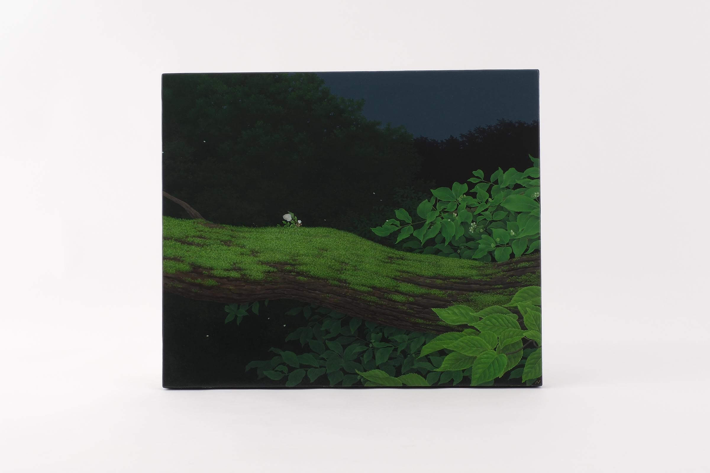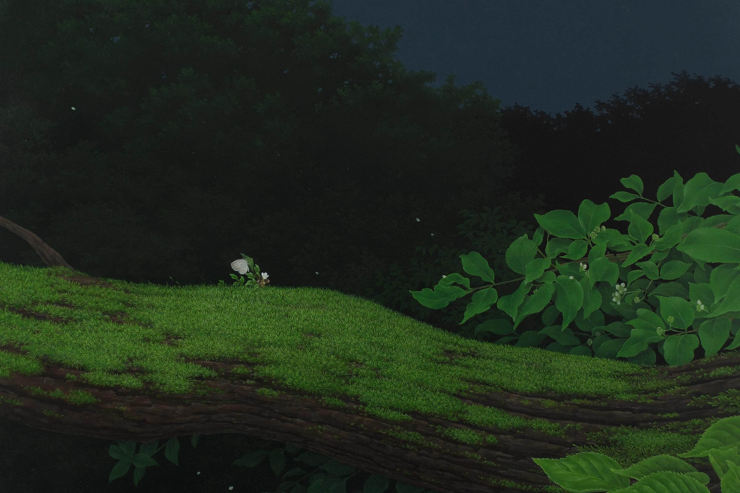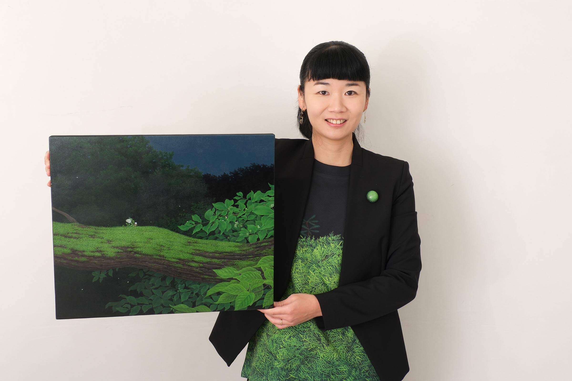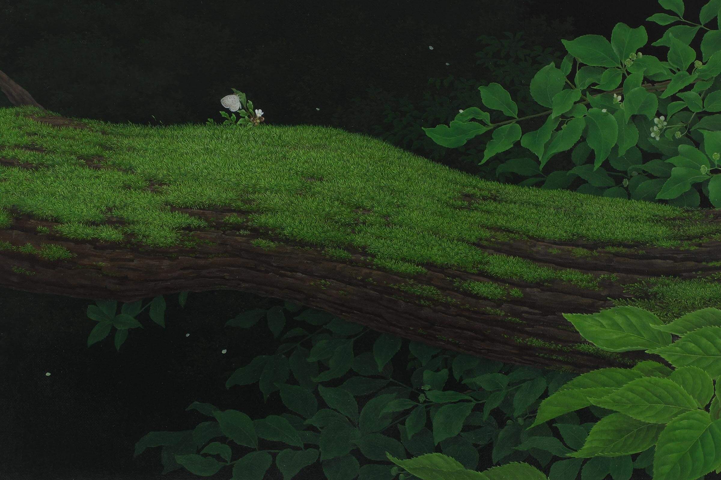 「おもいやり」を調べると“気持ちに寄り添って気遣いをする”とか、“助けになる行動をする”という意味がありました。それを自分の作風に合わせていき、植物を育む優しさと自然の厳しさを兼ね備えた森を描いて表現しようと思いました。木に生えた苔は一本一本を筆で緻密に描き込み、夜の森の明闇を緑の色調で描いています。パークホテルの展示会場で作品を森が見える窓のように飾りたいと思って描きました。そこだけが別空間になるように作品を楽しんでもらえたらと思います。