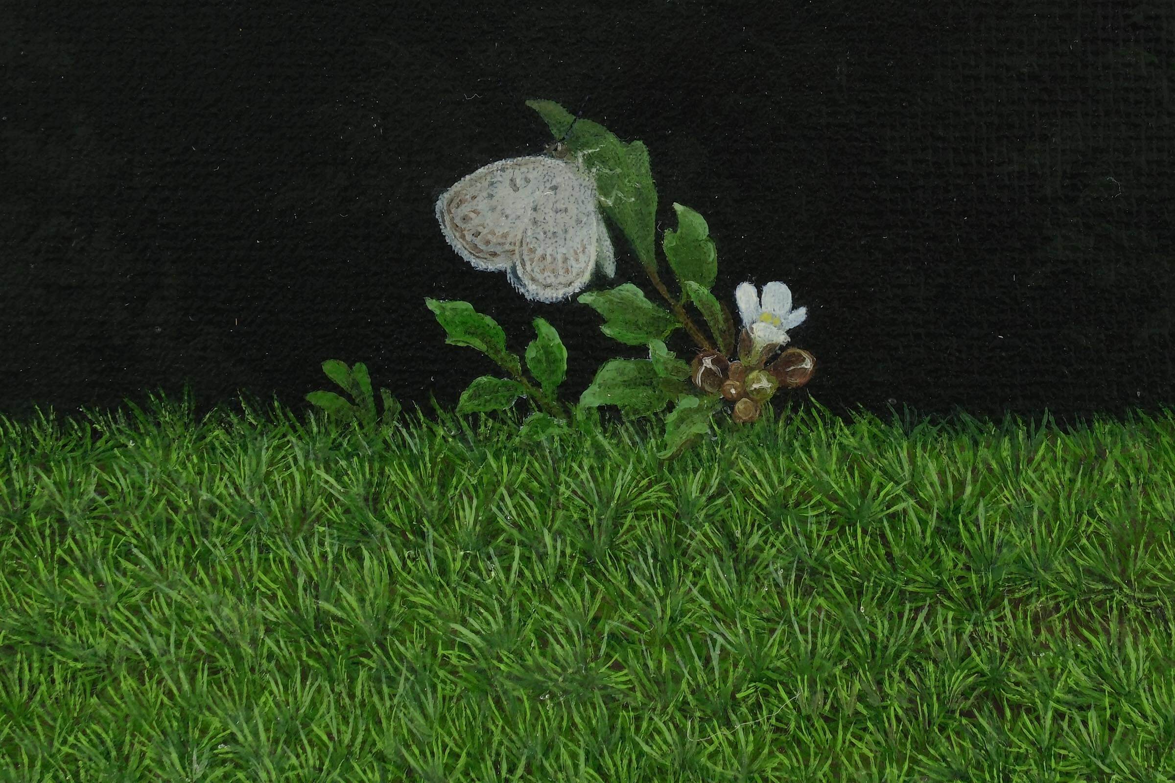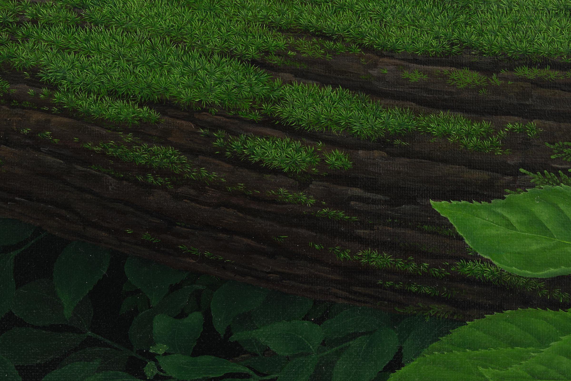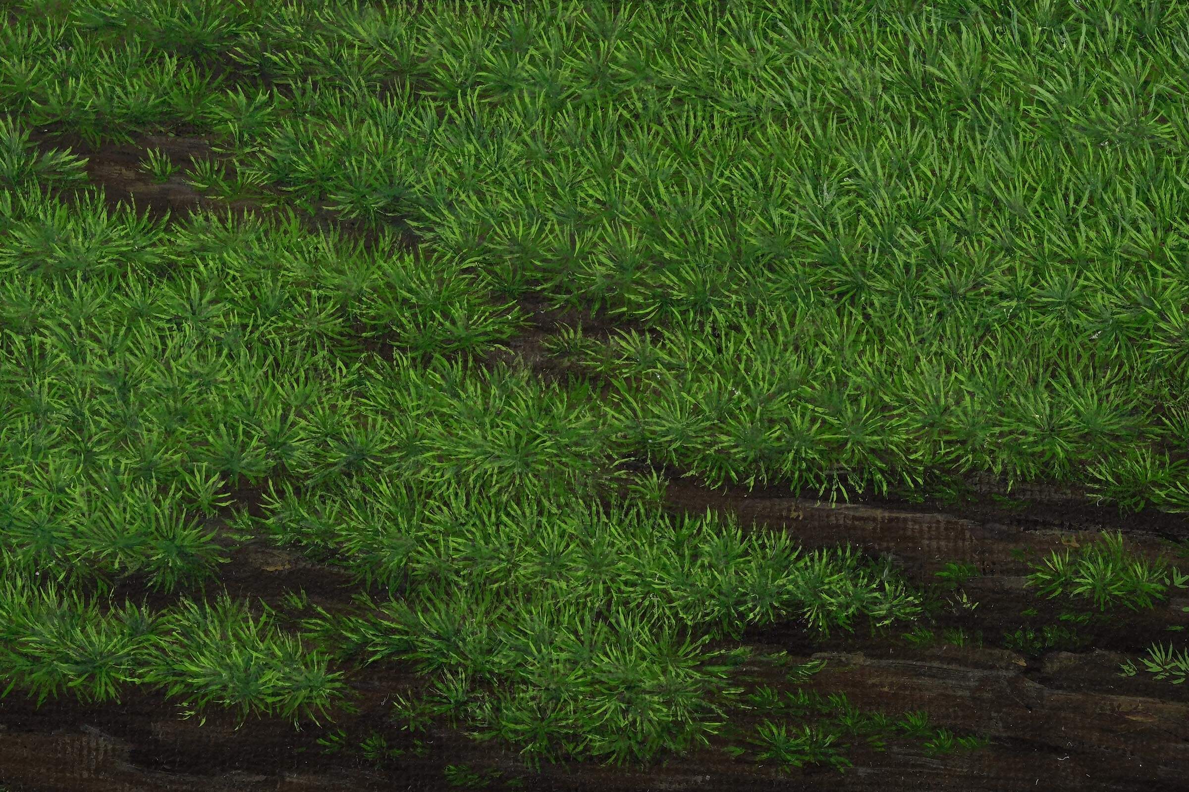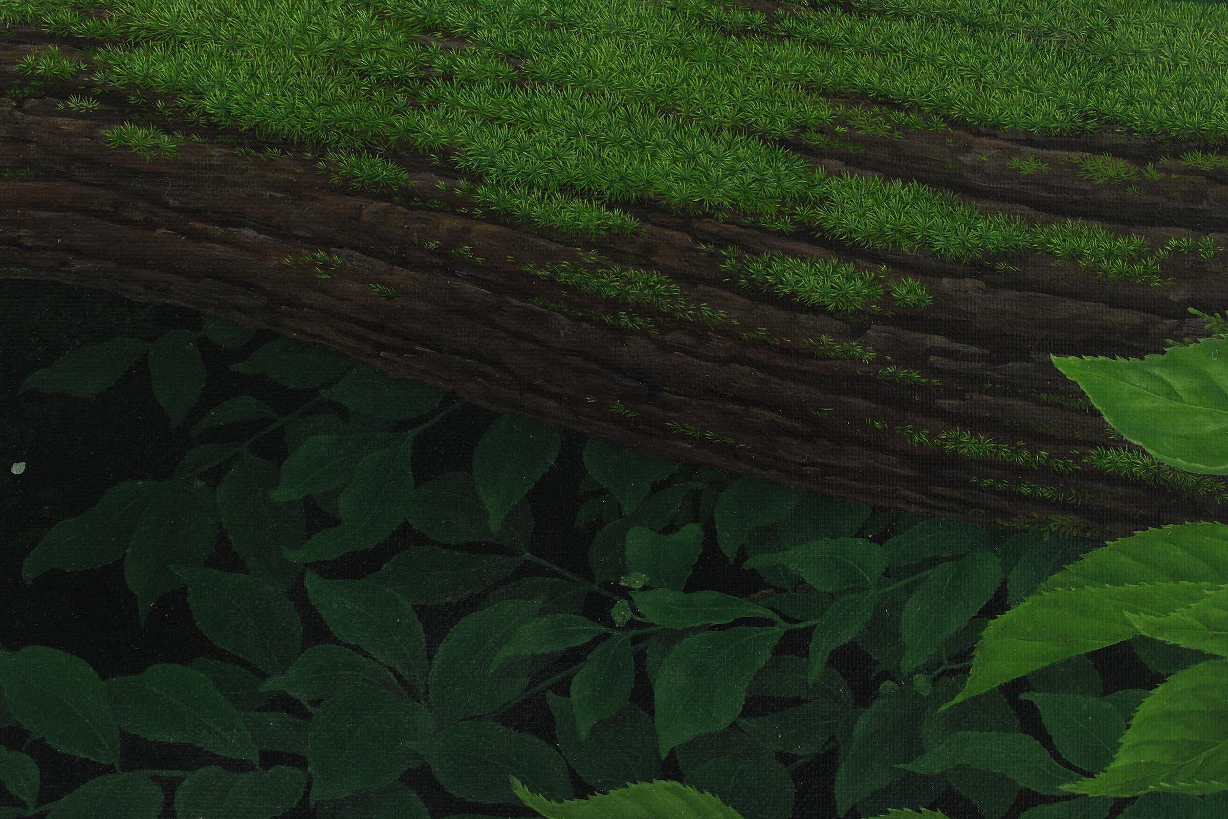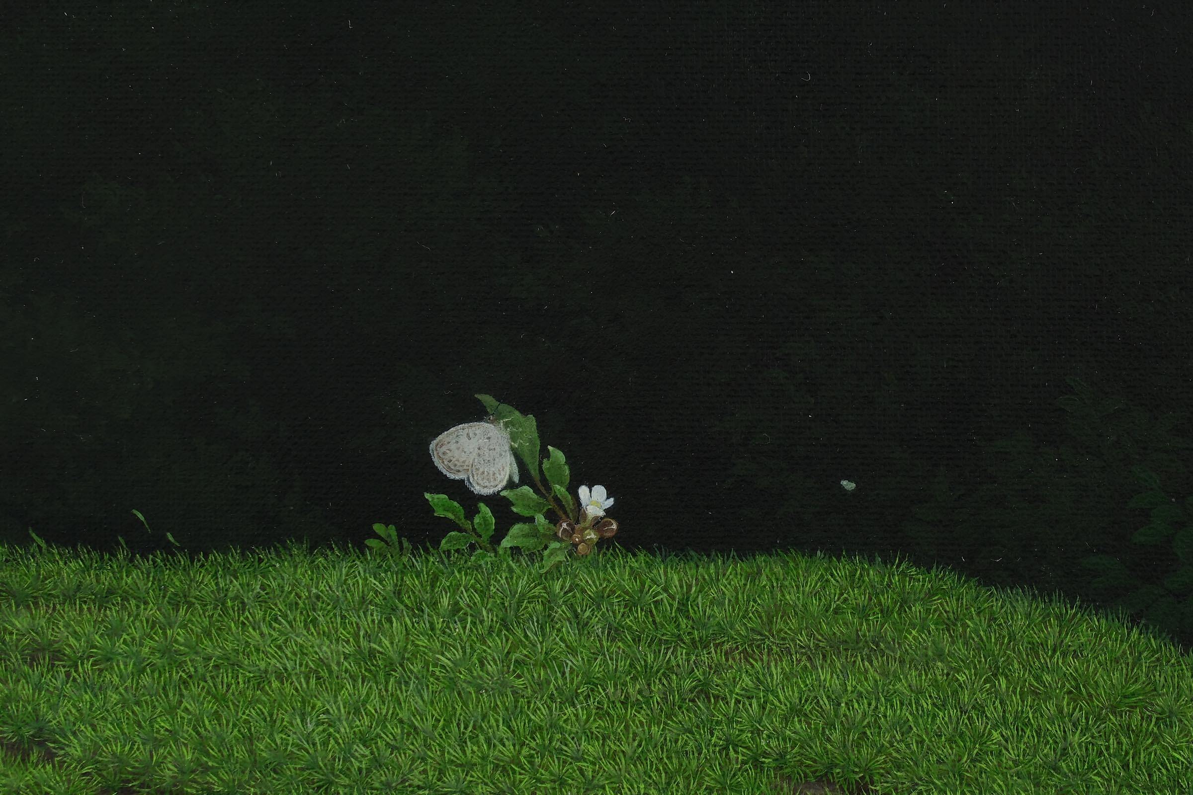 「おもいやり」を調べると“気持ちに寄り添って気遣いをする”とか、“助けになる行動をする”という意味がありました。それを自分の作風に合わせていき、植物を育む優しさと自然の厳しさを兼ね備えた森を描いて表現しようと思いました。木に生えた苔は一本一本を筆で緻密に描き込み、夜の森の明闇を緑の色調で描いています。パークホテルの展示会場で作品を森が見える窓のように飾りたいと思って描きました。そこだけが別空間になるように作品を楽しんでもらえたらと思います。