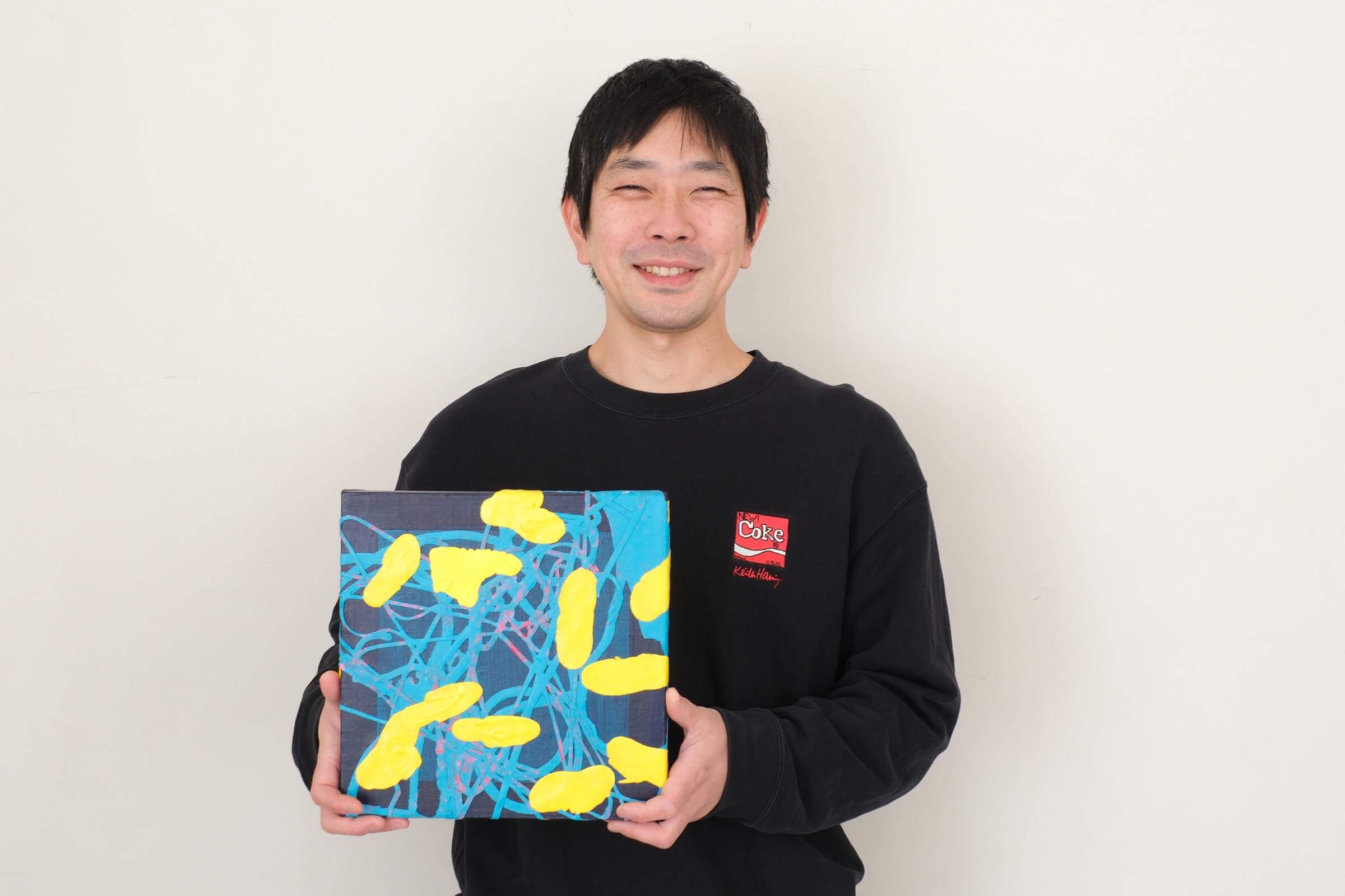 「なるほど」はひらめきや納得という意味ですが、目上の人に使うと失礼という意味があることを知りました。そこから「なるほど」と思う思考回路の瞬間を、植物の蔦から花が開くイメージの作品にしました。蔦は普段から用いている延長コードやハンガーのフォルムを重ね合わせ、花には言葉が持つ“失礼”な部分から靴にしました。抽象的にするためにモチーフのフォルムを単色で表現しました。各モチーフが一体化するように、切ったキャンバスを貼り合わせたので、どう見えるのか想像しながら鑑賞してもらえたらと思います。