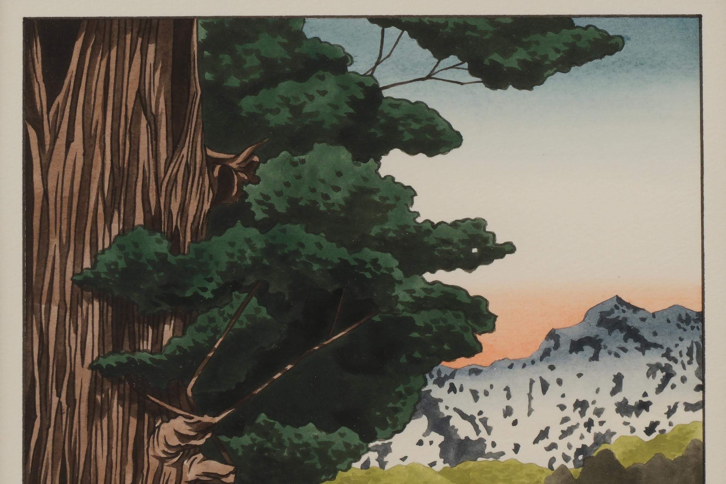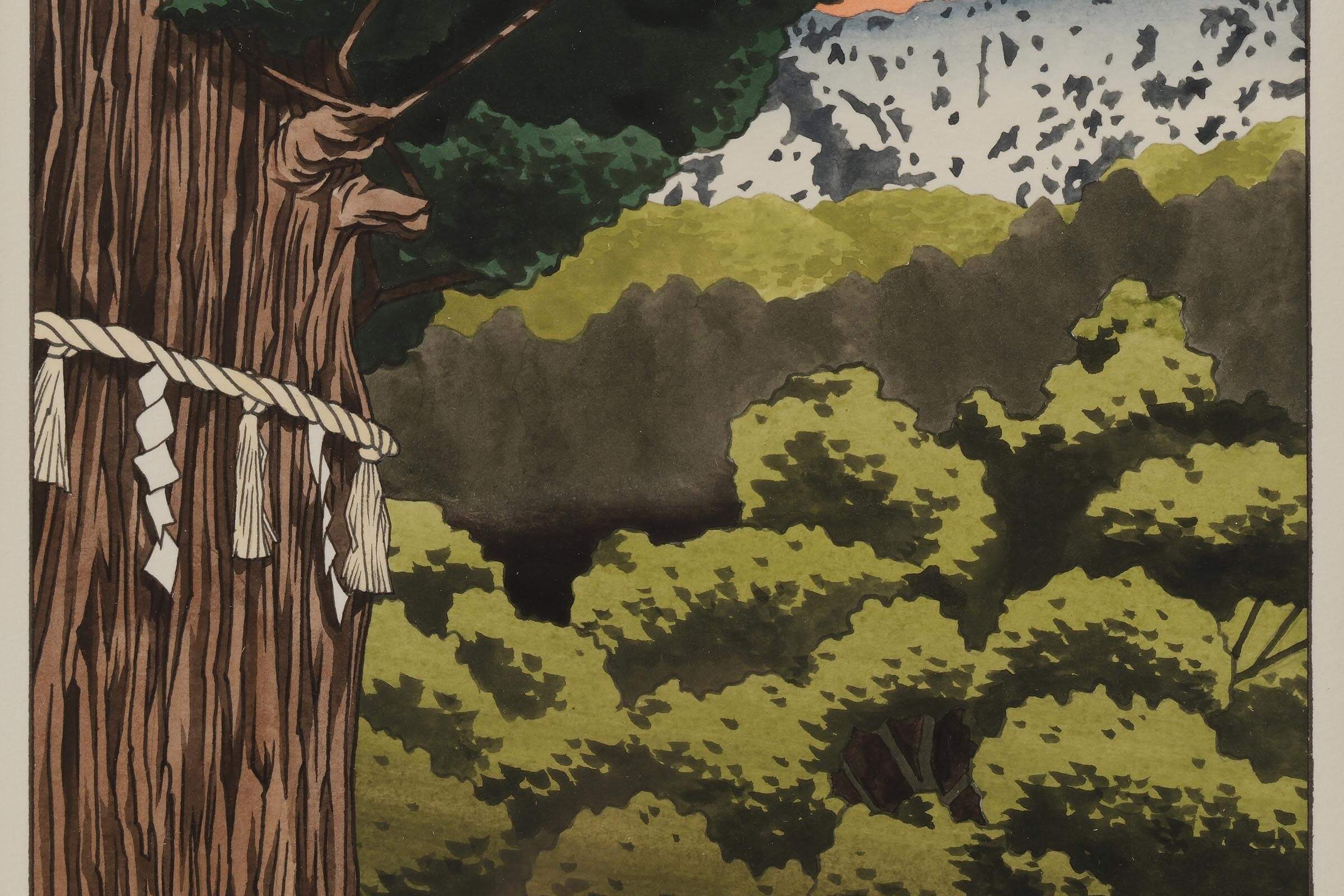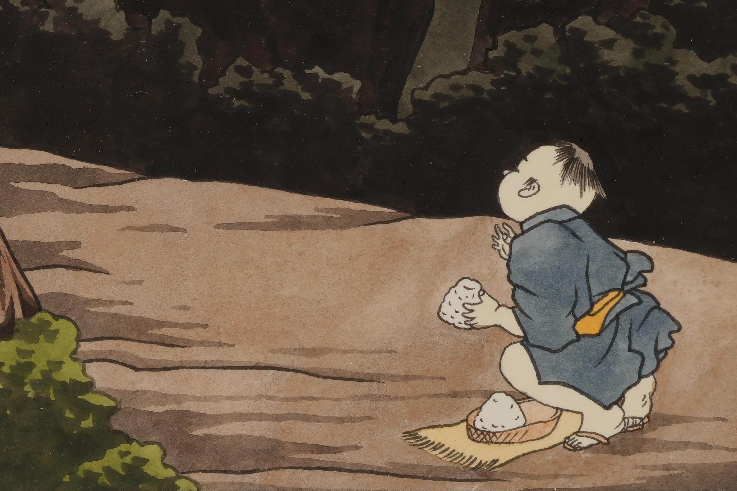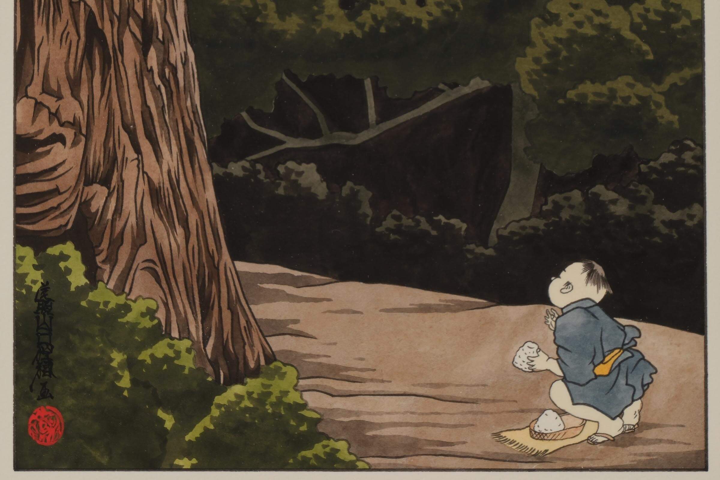 描いたのは「おむすび」を食べる子供の手が止まるほど、圧倒的な存在感を放つ木です。何かが生まれる瞬間に存在する目には見えない空気感を描きました。木の描写は木版の表現に寄せつつも肉筆で描いているので、実際に作品をご覧いただけたらと思います。