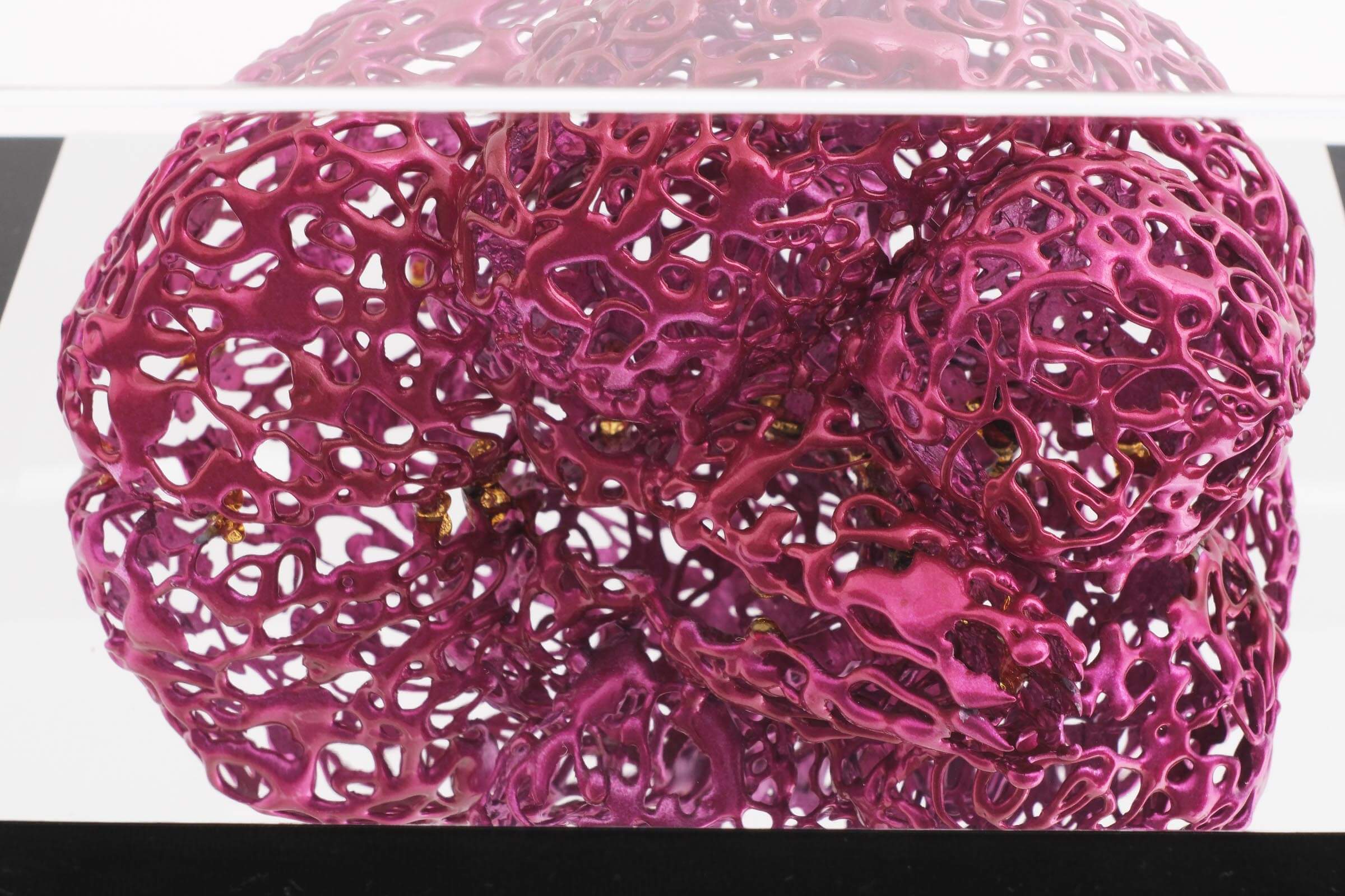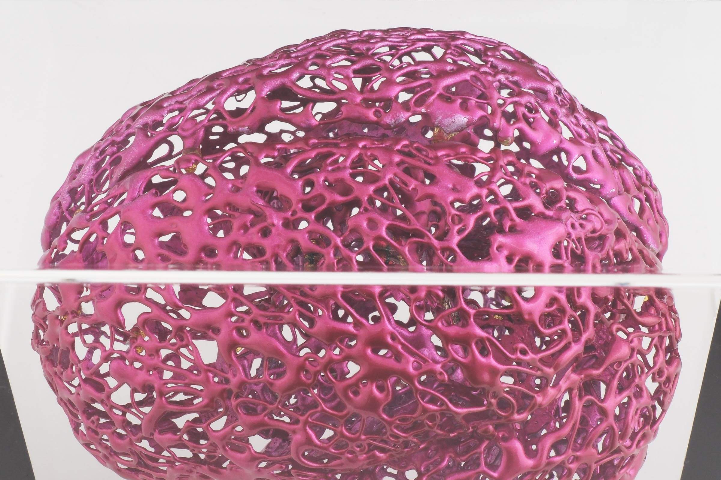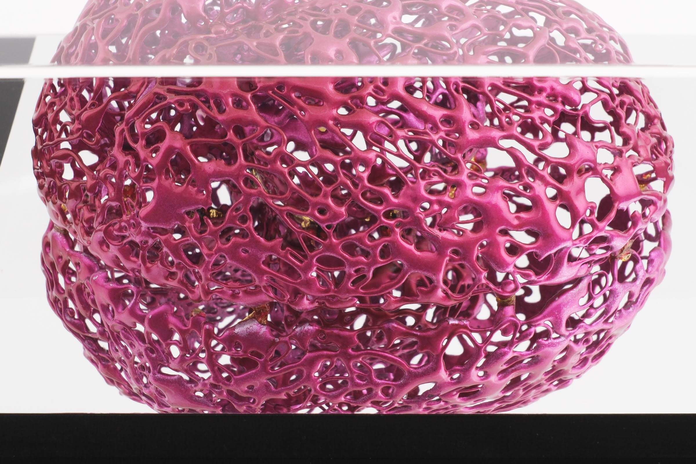 水口:グルーガンは接着剤なので基本は無色ですが、色付きのものを使って作っています。鉛筆くらいの太さのグルーを熱で溶かして使いますが、グルーを替えたときに前の残りが少し混ざって最初だけ色が変化します。それがマーブリングのような感じで面白くて、この状態を持続できないかと思って作風が生まれました。グルーを細かく切って装填して色の混ざりを表現していますが、重ねる色の順番によって変色の具合も変わるので、実験をしながら作っています。色付きのグルーは色だけでなくて樹脂の比率も変わるので剛性も変化します。なので各色で温度の耐性テストをしたり、長時間水に浸けたらどうなるのかも実験します。グルーガン素材は単体では弱いので、塗装や描き方などさまざまなテクニックを組み合わせて、強度も持たせた作品に仕上げています。