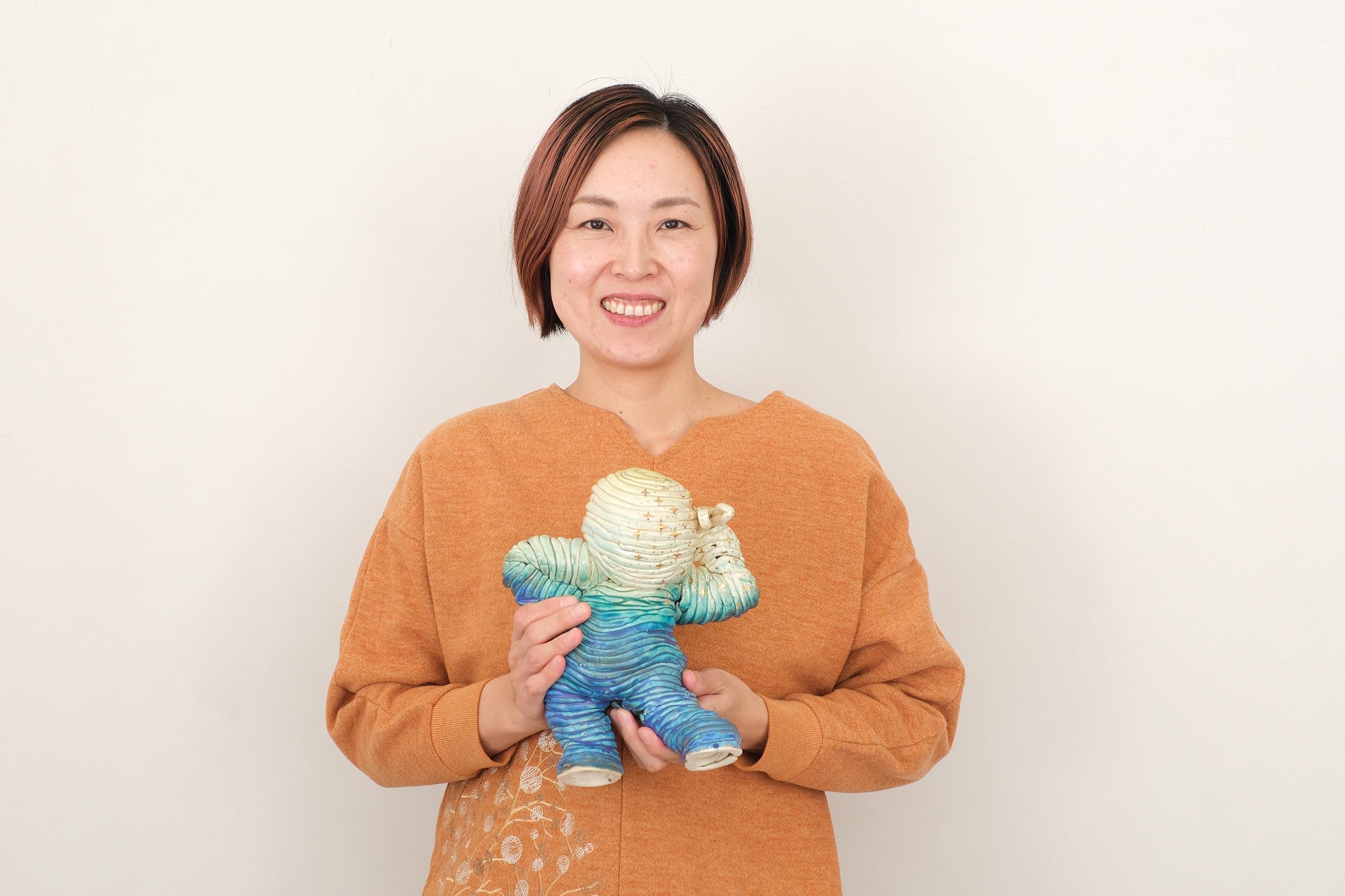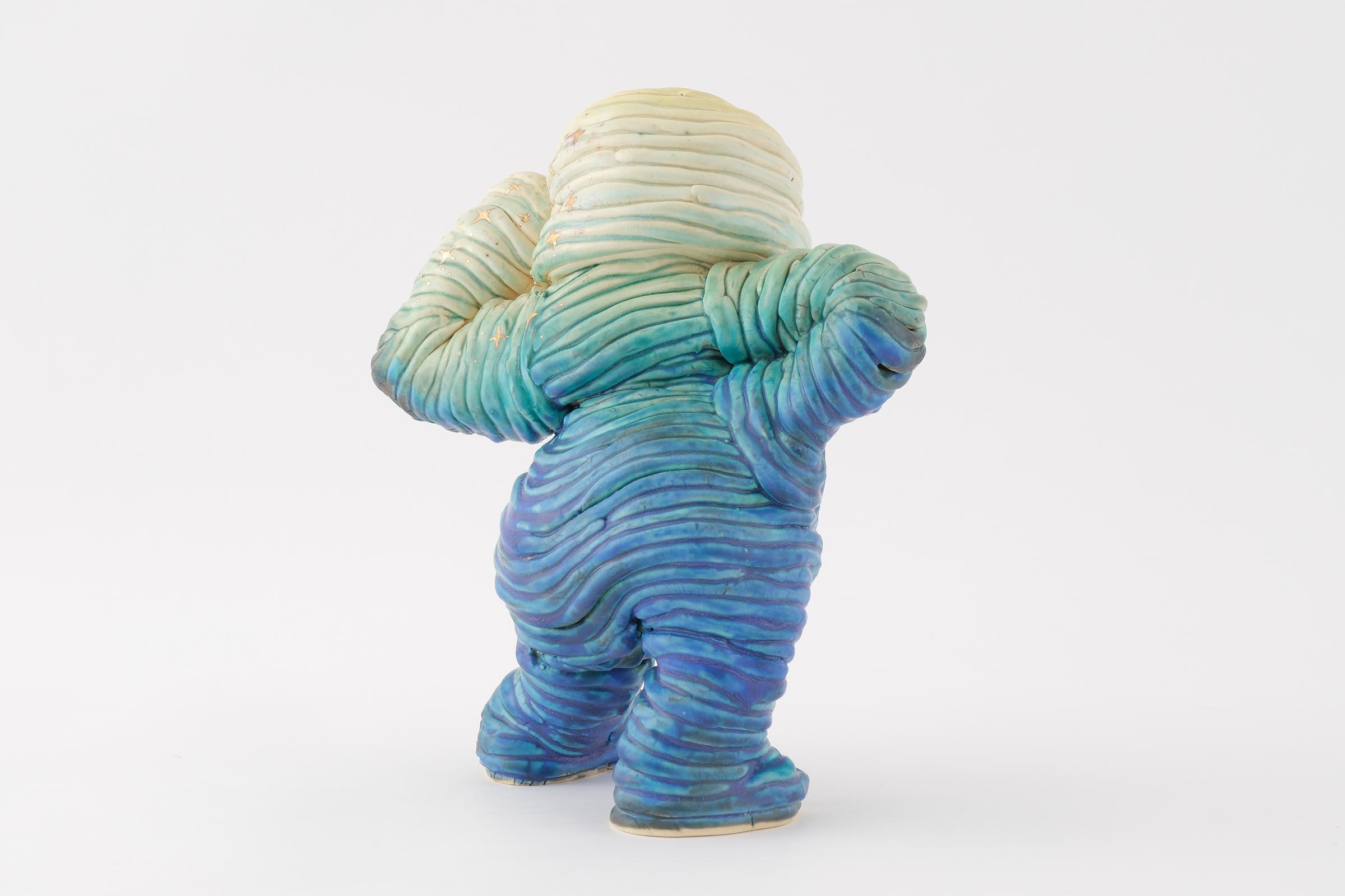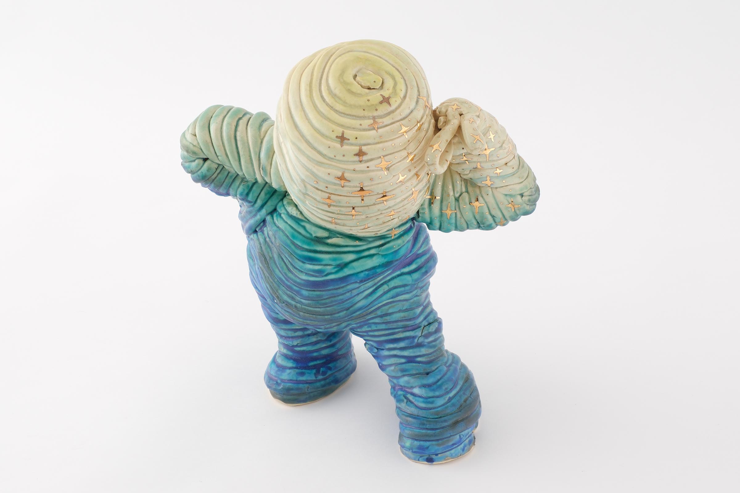下の娘には障害があり成長もゆっくりで、ひとりで立つのにもリハビリをはじめとしたいろんな過程がありました。その積み上げる感じが手びねりで焼き物を作る作業と重なり、紐のカタチを残しながら立っている人を作ろうと思いました。娘のように立っていてもどこかグラグラした感じを表現しました。釉薬も下はマットで上は艶を出し、金彩でキラキラ感を加えて完璧なバッチリ感を出しました。個人的には背中の肉感も気に入っているのでぐるっと一周を見てほしいです。