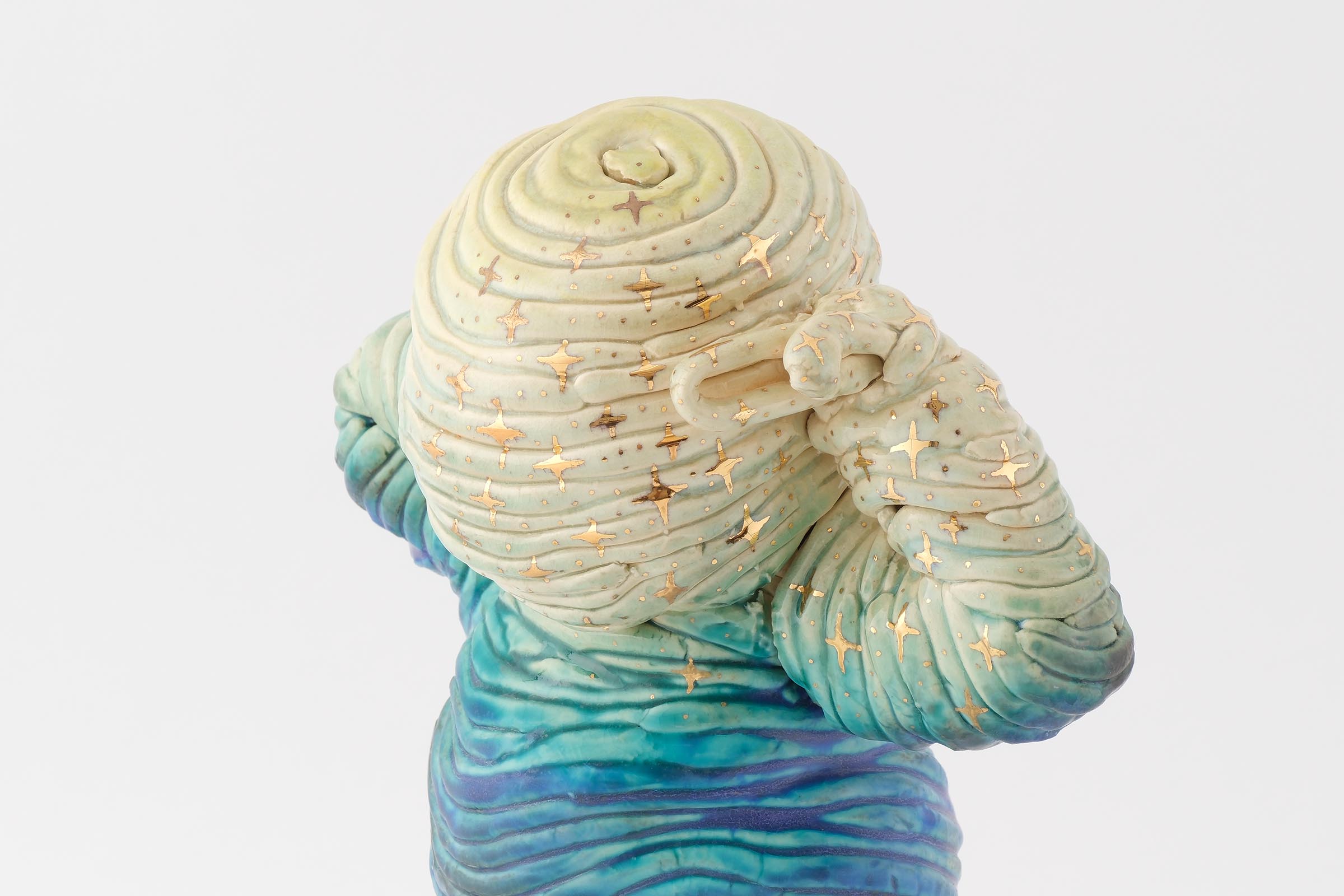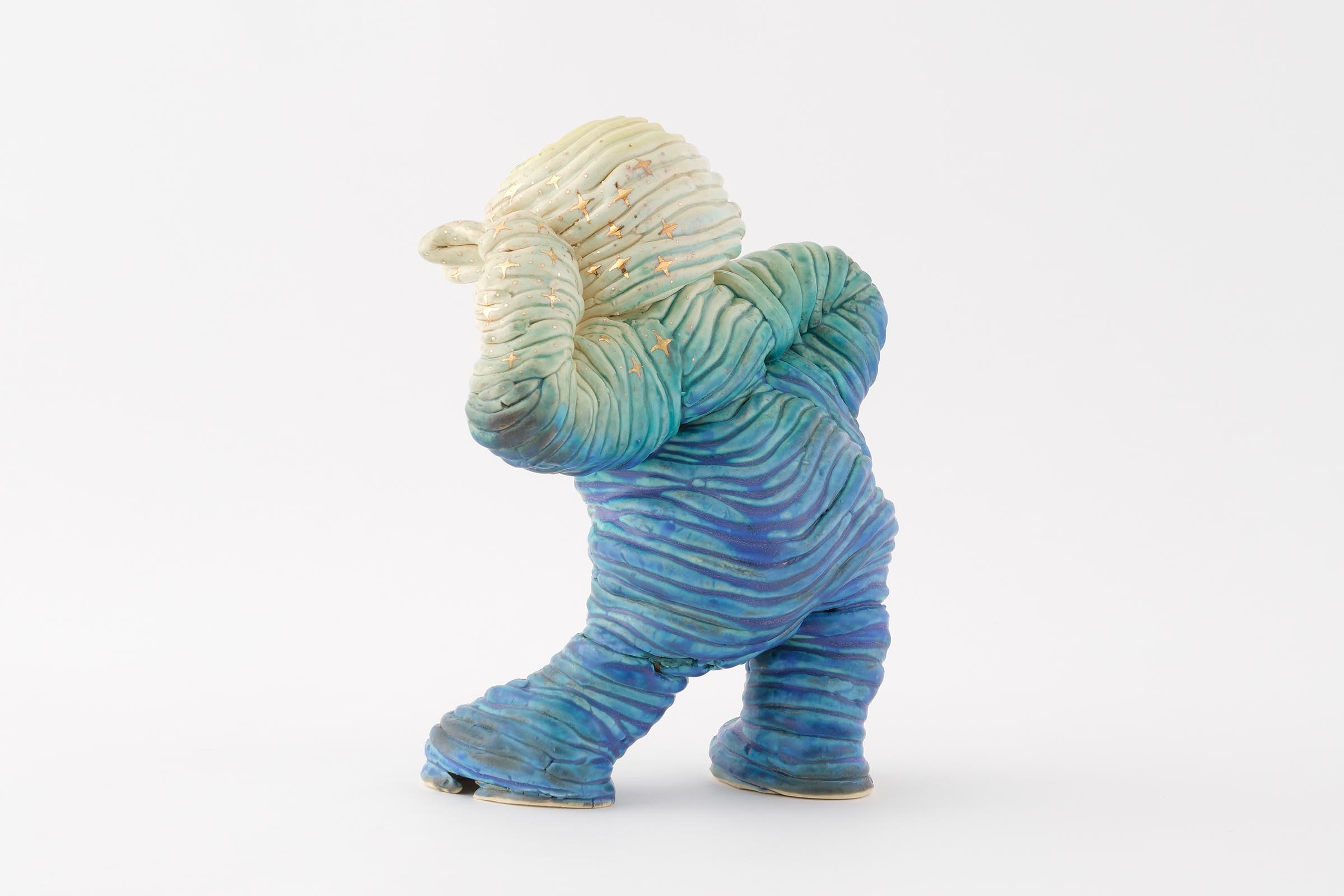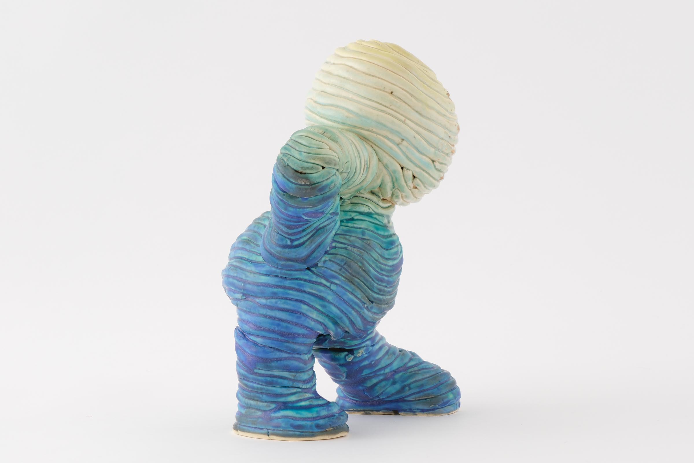 下の娘には障害があり成長もゆっくりで、ひとりで立つのにもリハビリをはじめとしたいろんな過程がありました。その積み上げる感じが手びねりで焼き物を作る作業と重なり、紐のカタチを残しながら立っている人を作ろうと思いました。娘のように立っていてもどこかグラグラした感じを表現しました。釉薬も下はマットで上は艶を出し、金彩でキラキラ感を加えて完璧なバッチリ感を出しました。個人的には背中の肉感も気に入っているのでぐるっと一周を見てほしいです。