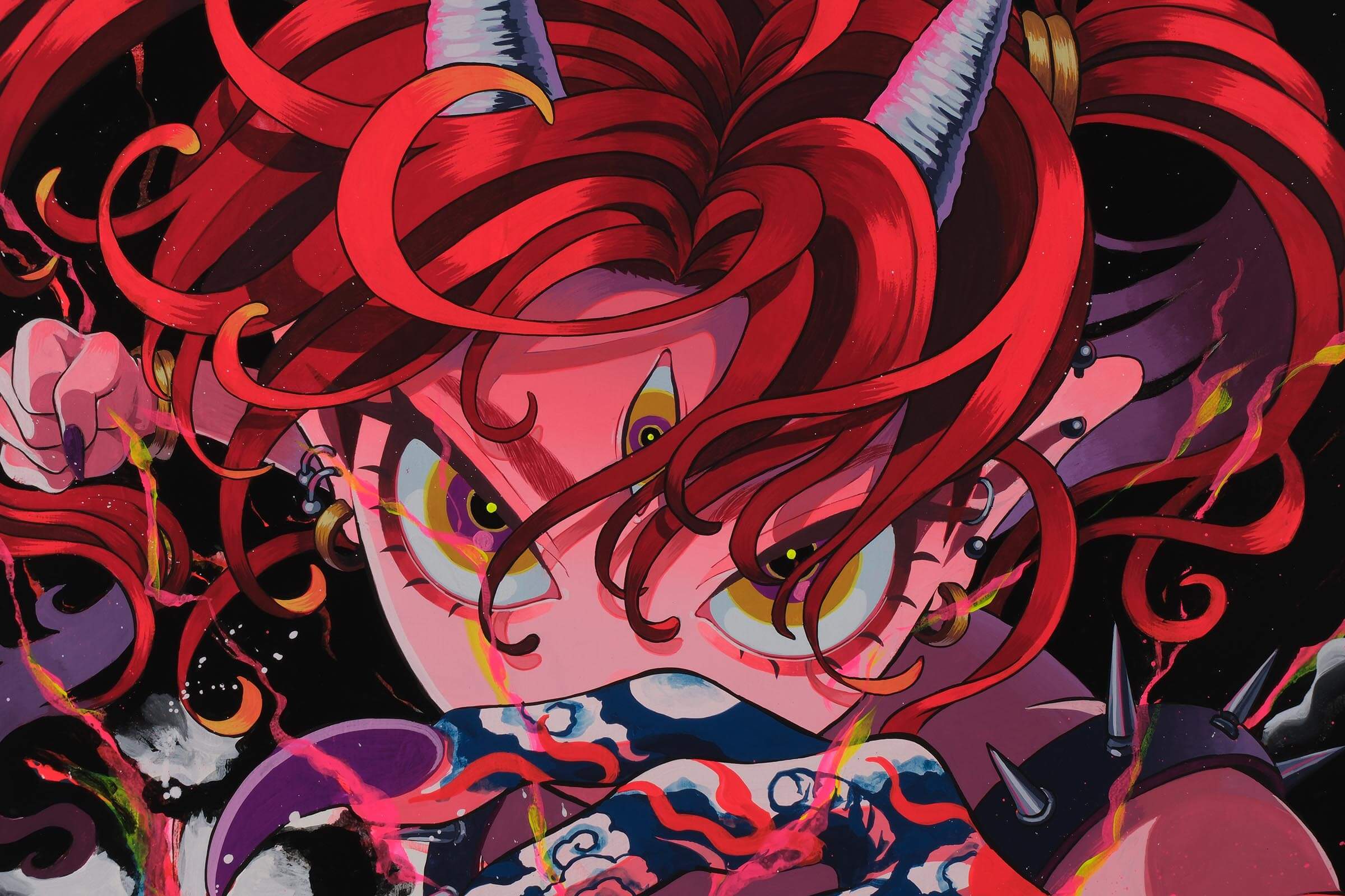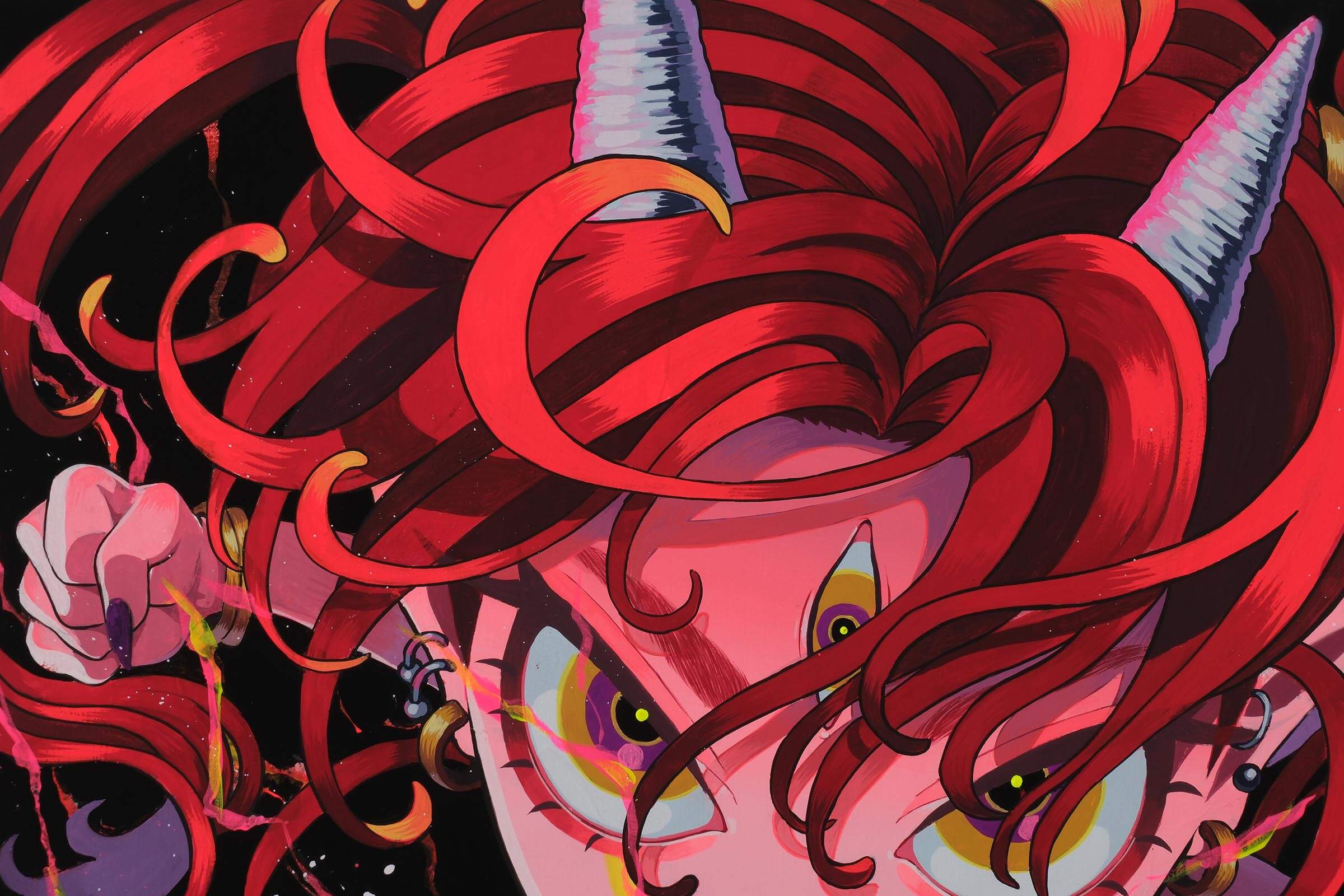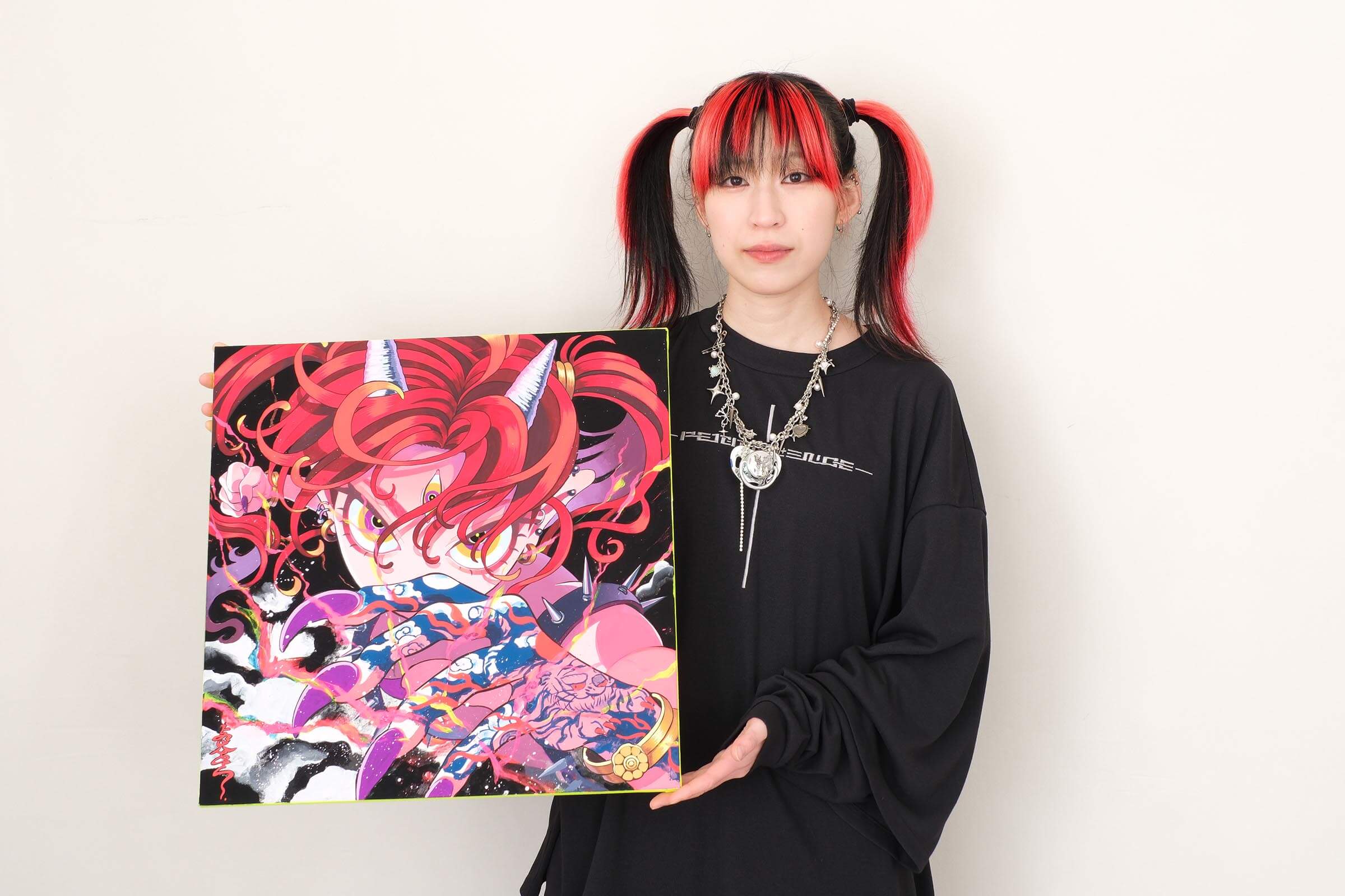 地獄をテーマにした作品を作っていて、「いらっしゃいませ」は地獄に落ちた人間への一発目のぶん殴りを“地獄にようこそ”の意味で描きました。私にとって地獄は戦いであり、人間の更生施設だと思っています。なので、ここに描いた地獄の鬼も人間を救うため、性根をたたき直すために、こういうことをしています。これまでは筆致を残さないタッチで描いていましたが、あえて残すように描きました。作品から力強さを感じてもらえたらと思います。