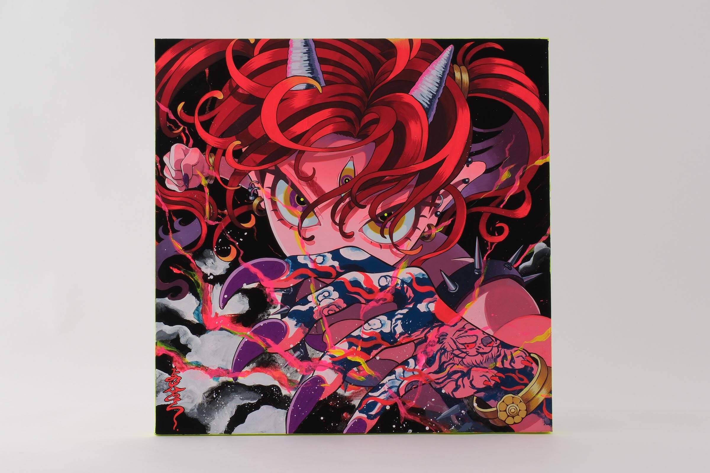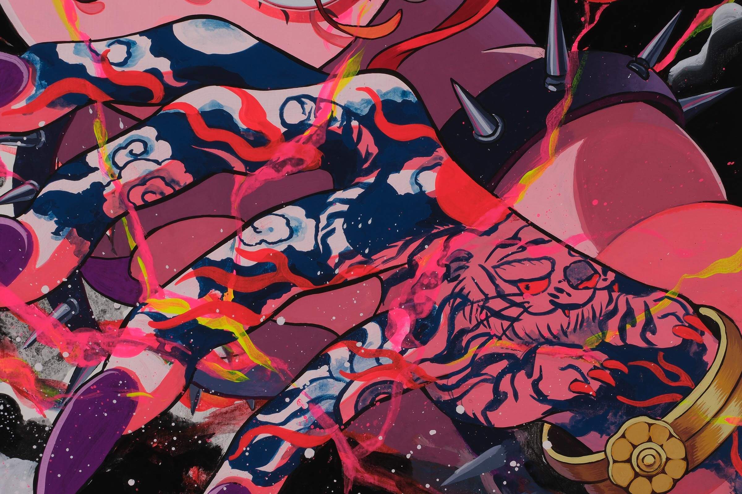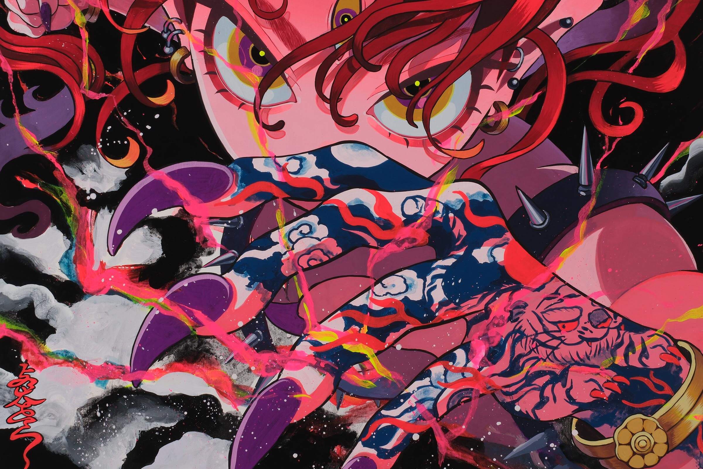 地獄をテーマにした作品を作っていて、「いらっしゃいませ」は地獄に落ちた人間への一発目のぶん殴りを“地獄にようこそ”の意味で描きました。私にとって地獄は戦いであり、人間の更生施設だと思っています。なので、ここに描いた地獄の鬼も人間を救うため、性根をたたき直すために、こういうことをしています。これまでは筆致を残さないタッチで描いていましたが、あえて残すように描きました。作品から力強さを感じてもらえたらと思います。