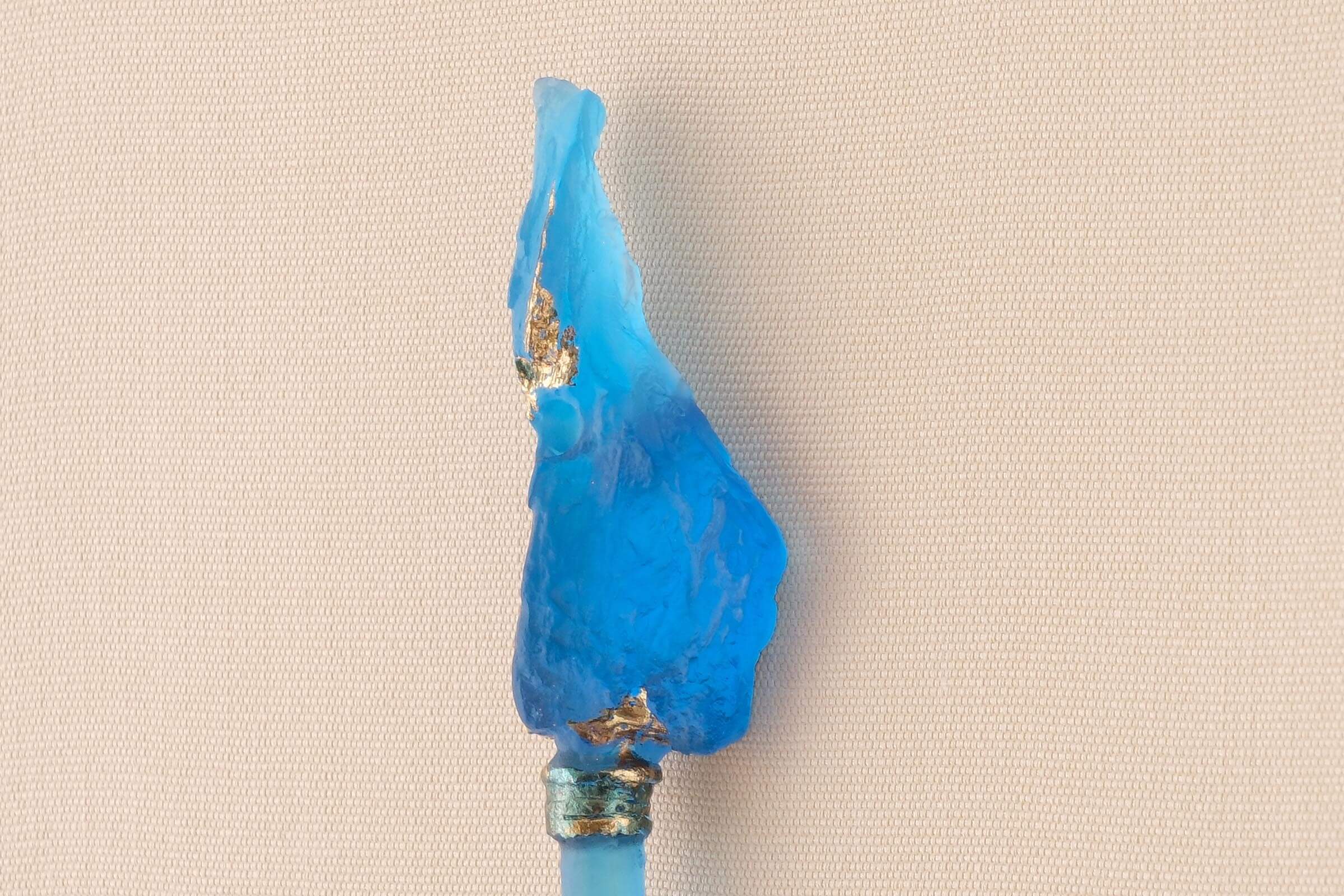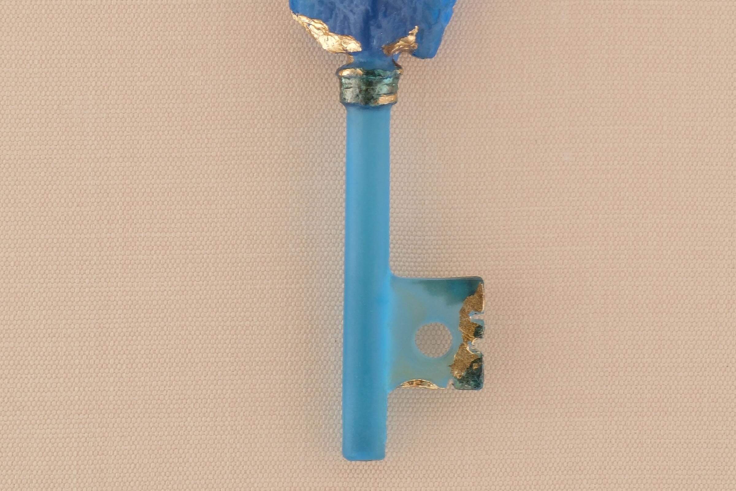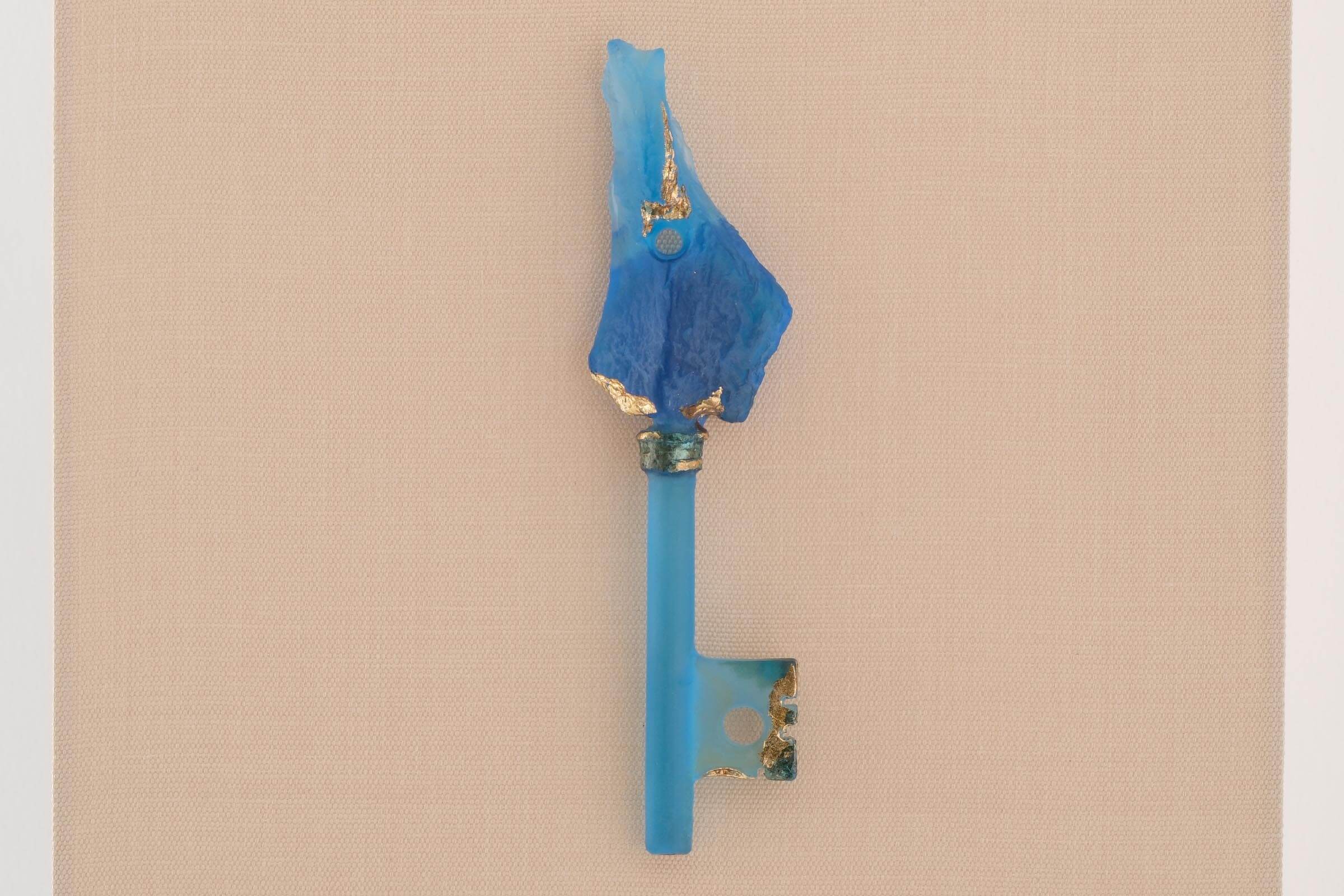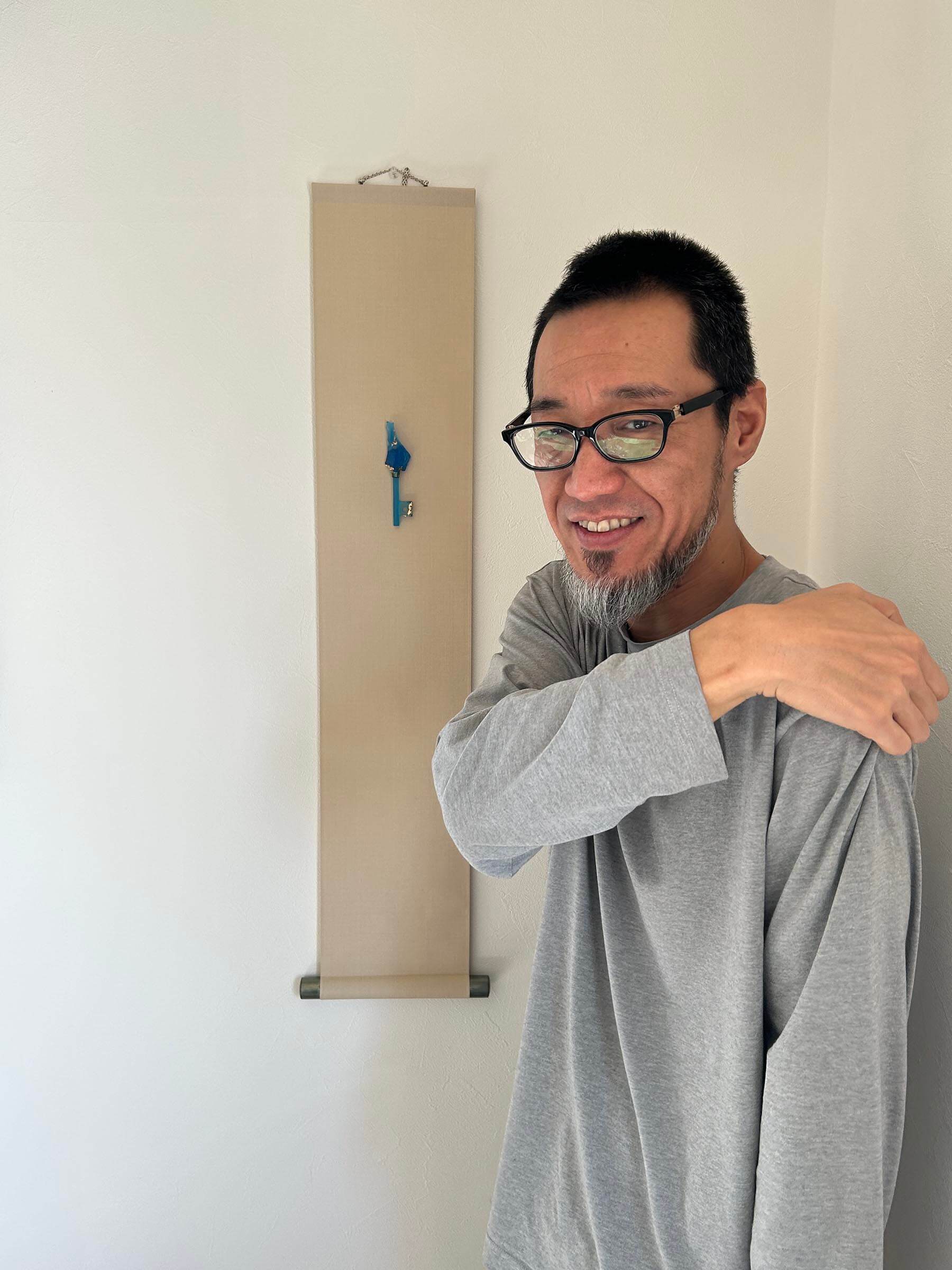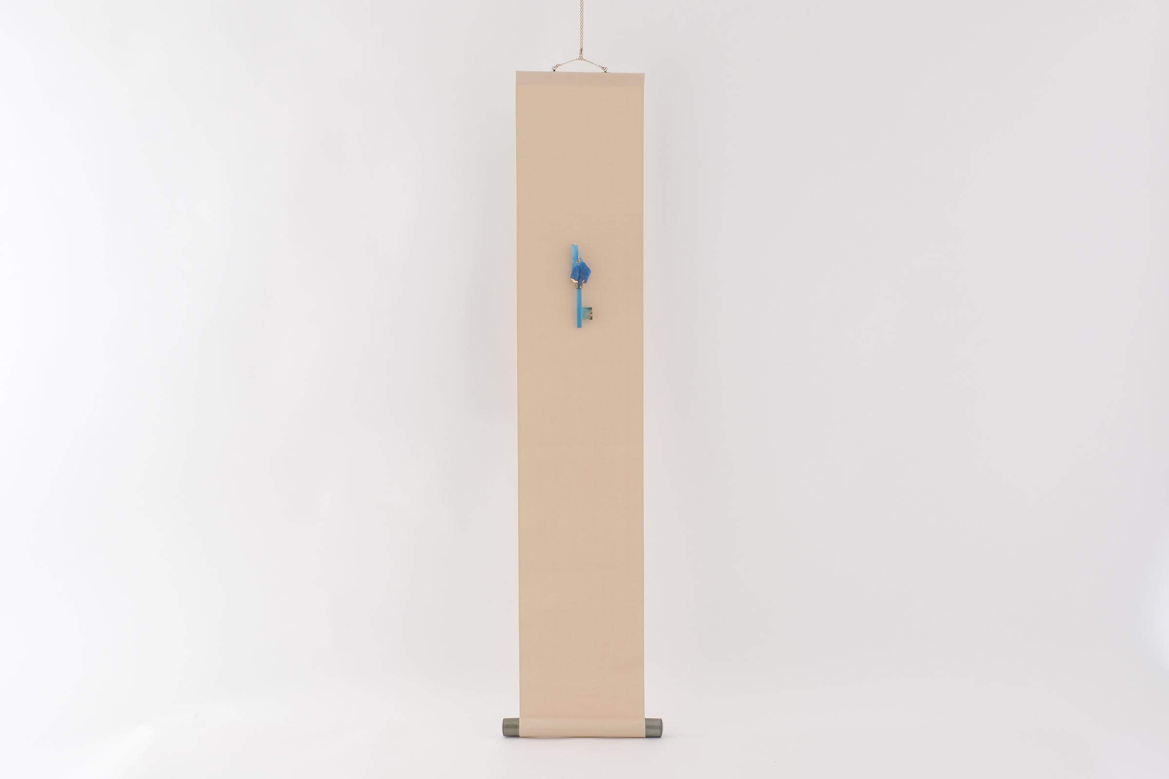 静寂のなかに存在する感じを出すために、掛け軸の余白に物体があるようにしました。モチーフはガラスで作った鍵です。鍵は「バッチリ」合わないと開きません。しかもガラスですし、見えないものが開くかもしれません。ガラスという素材感を見てもらえたらと思います。