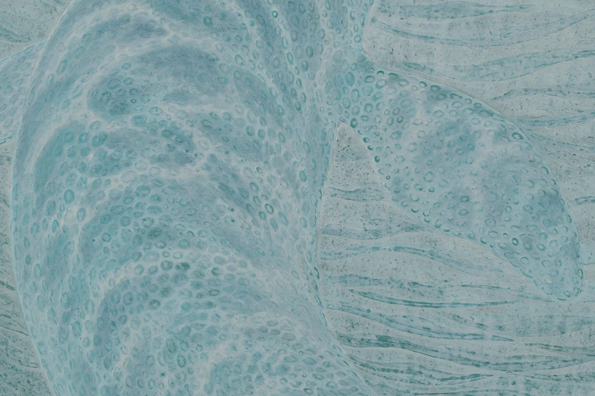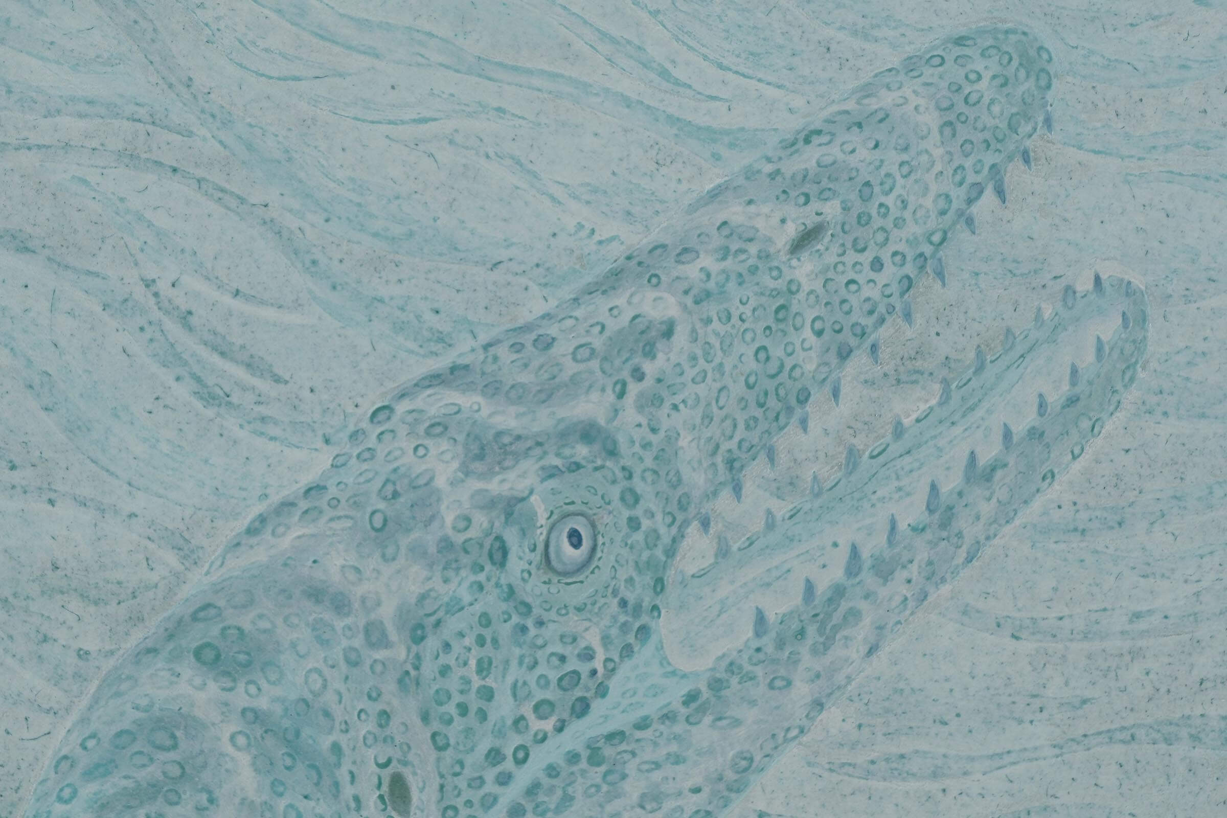 木下:これまでにあまり取り組まれていない技法で表現をしたいと思っていました。素材は日本画材ですが、絵肌をやすりで削って仕上げたらどうなるのかと思ってはじめたのが今の手法です。最初に取り組んだモチーフはアンモナイトでした。岩絵の具自体が石の粉ですから、化石の物質感を強調した絵肌が作れるんじゃないかなと。まず絵具をモデリングのように重ねていき、殻や鱗など生き物の細かい質感を作ります。岩絵具は厚みがあるとヒビが入りやすくなるので、何層にも分けて塗ります。最後に目の細かい耐水性の紙やすりで磨き上げ、絵肌に艶を出します。この技法自体は油絵の下地作り(エマルジョン)の方法で、それを日本画材に応用しています。