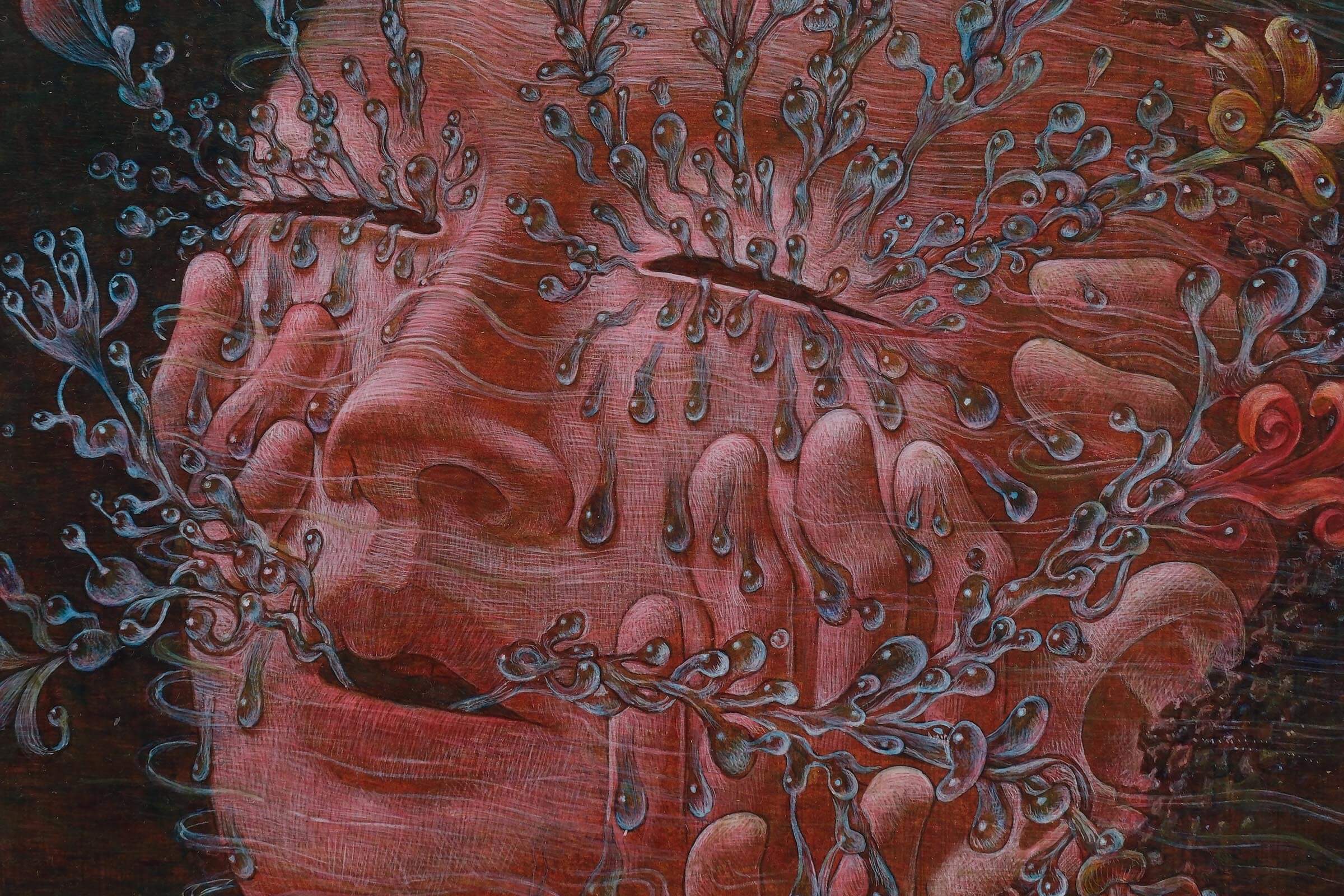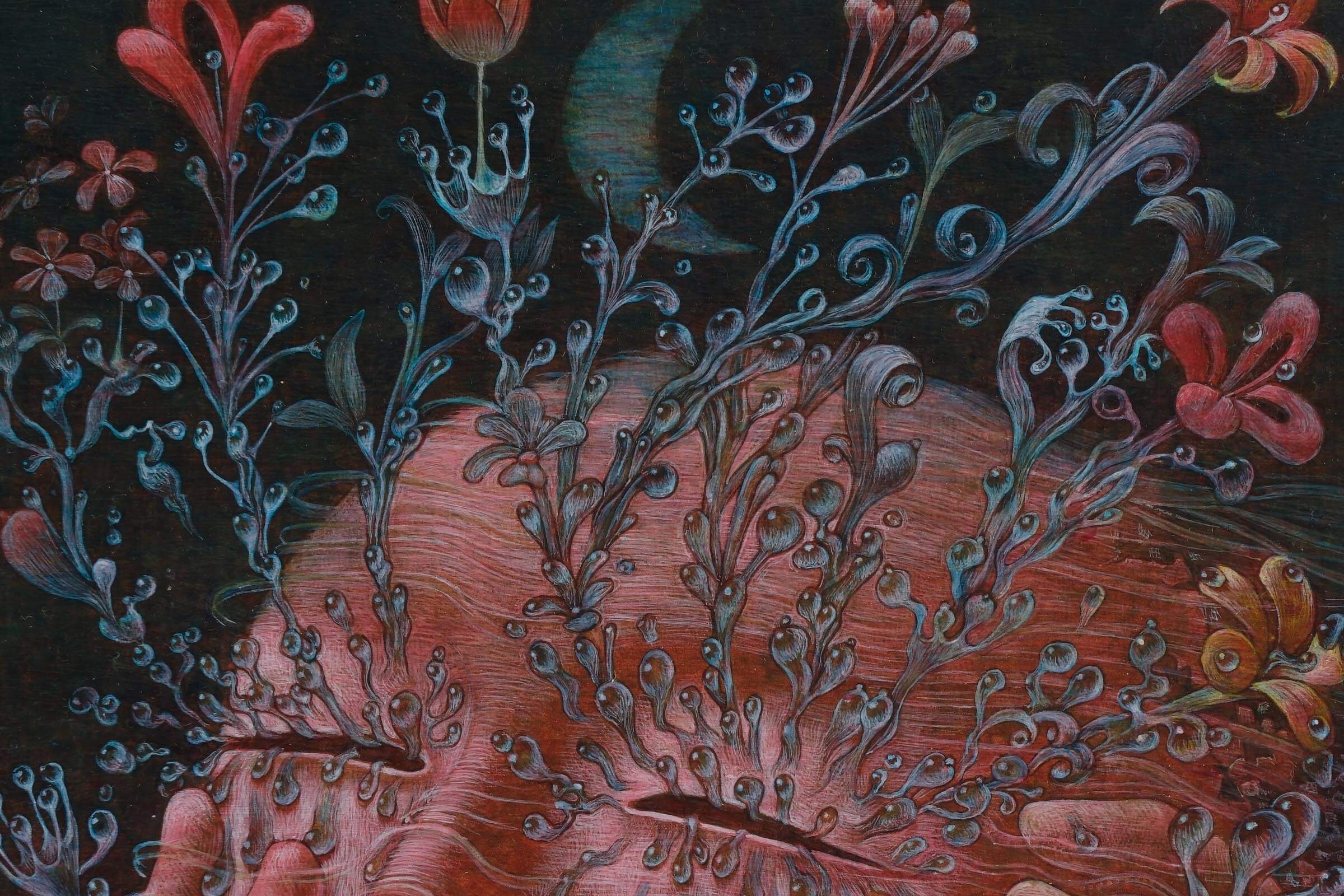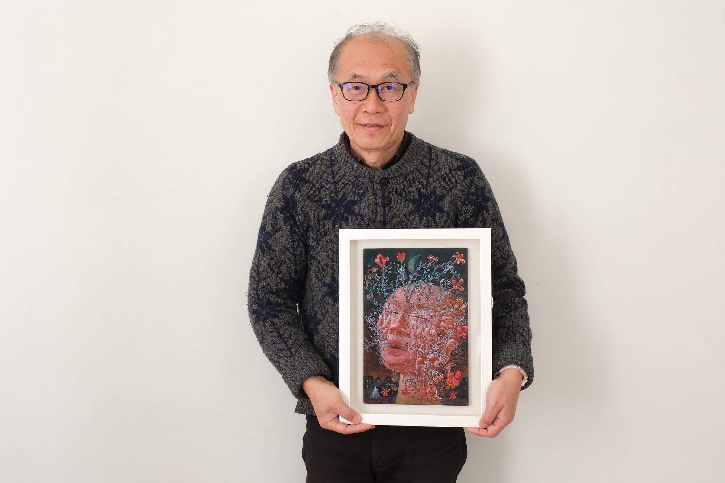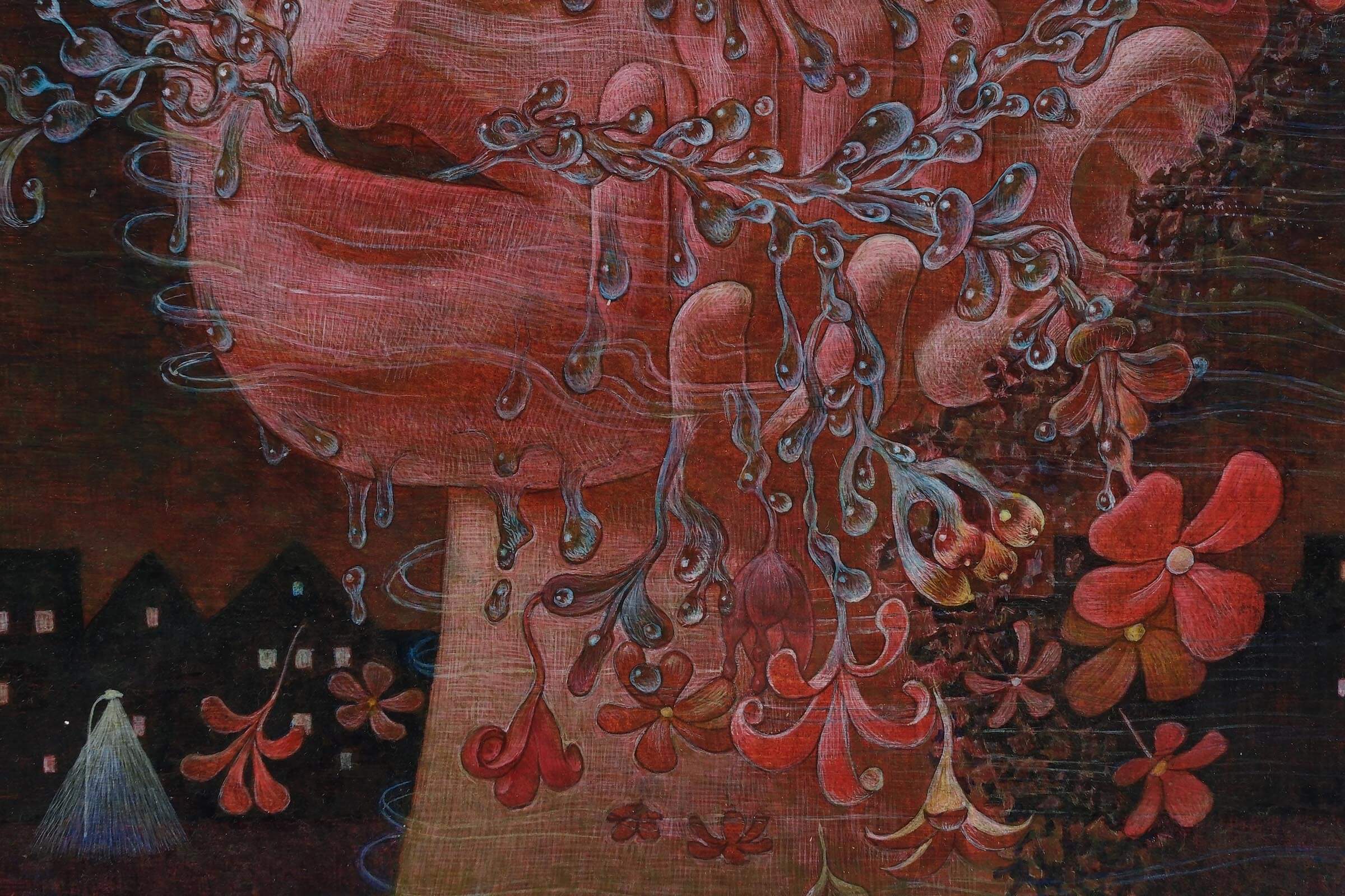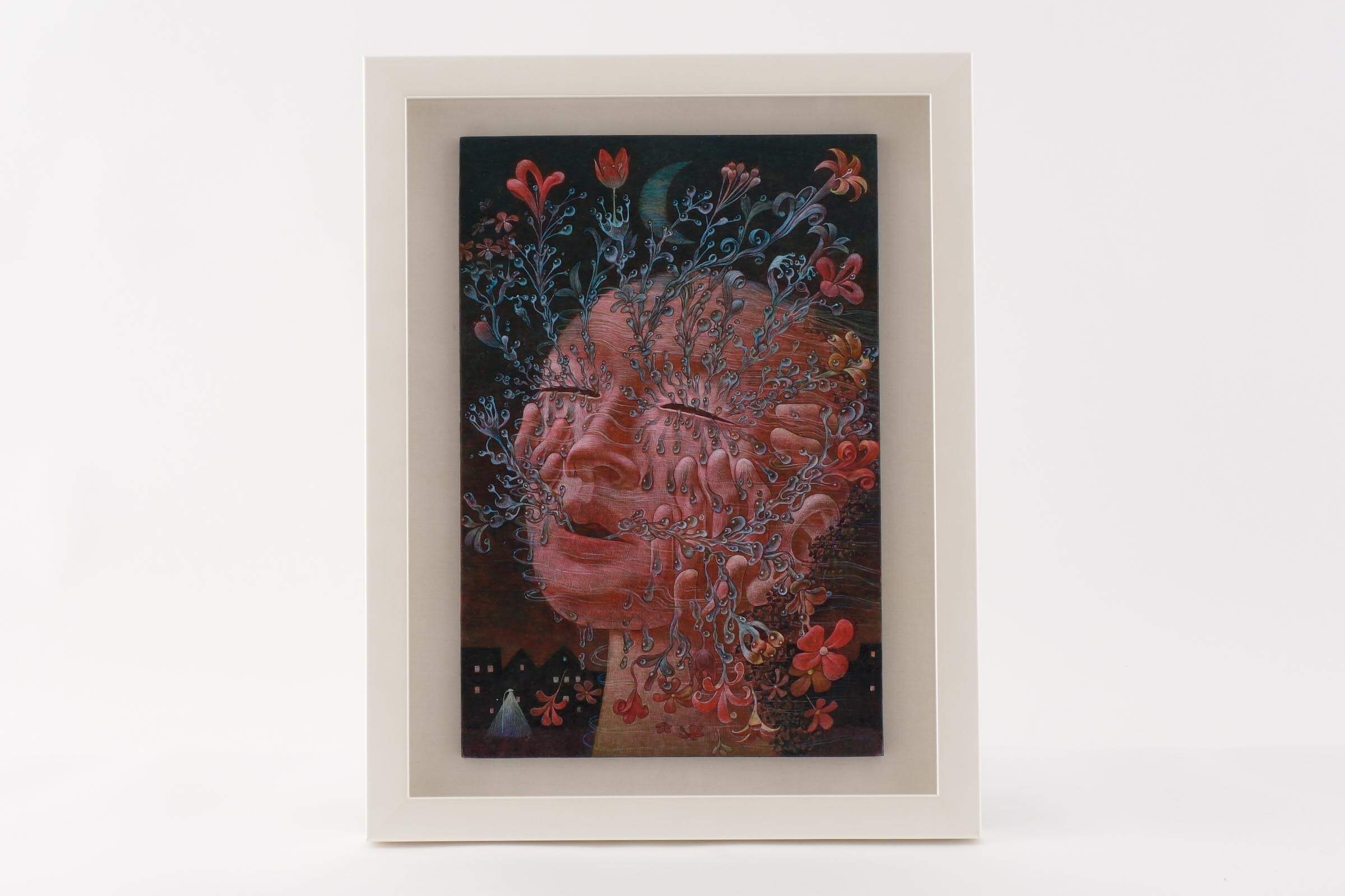 「うれしい」は自分にとってぴったりの言葉でした。普段から感情を題材にした作品を制作していて、人が泣く顔をよく描いています。泣くという行為は悲しいときでも嬉しいときでも起こるので、今回は嬉し泣きを描きました。ネガティブな感情を昇“華”してポジティブにしようと思い、涙が花(華)に変わる様と、落ちるだけでなく上にあがるように描きました。背景が夜なのは、私にとって夜中にジョギングをしたときの身体が風を切る感覚がポジティブに感じるからです。あと、真夜中は空よりも街のほうが暗い感じも表現しています。