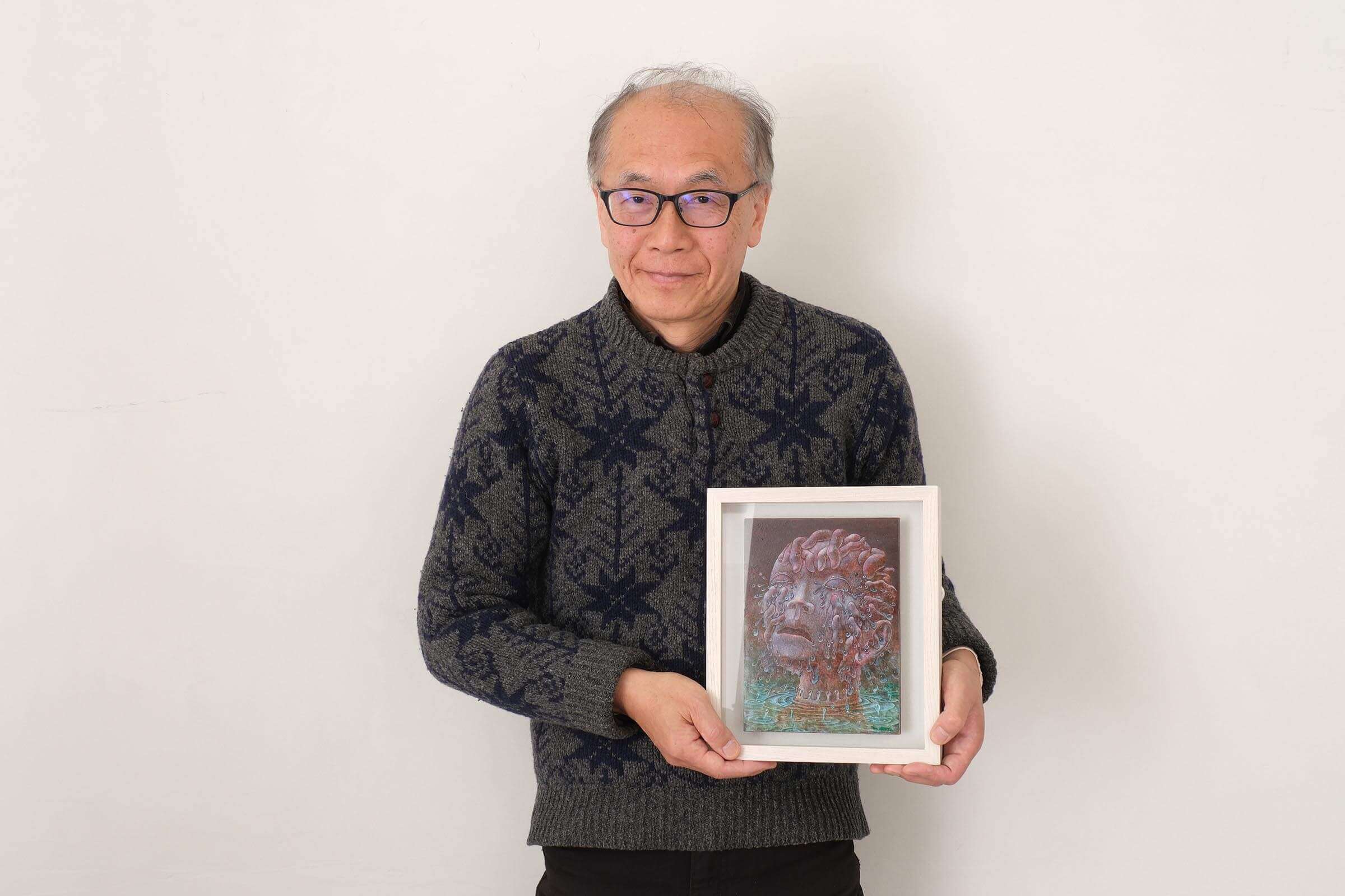 作田:大学卒業後は美術の先生をしながら、コラージュを銅版画で表現した作品を作り続けて、ある程度の評価を受けました。当時の作品は感情を入れ込まないシュールな表現でしたが、それを続けていくうちに自分のやりたいことが分からなくなり、今の作風にたどりつくまで迷い続けました。転機は45歳の頃に在学研修でオランダへ行ったときでした。現地のアトリエで滞在制作をするときもコンセプトが浮かばずに考え込んでいたら、“考えている自分を描こう”と思い、それが自分のなかで腑に落ちたんです。今までと真逆な“感情の表現”ですね。