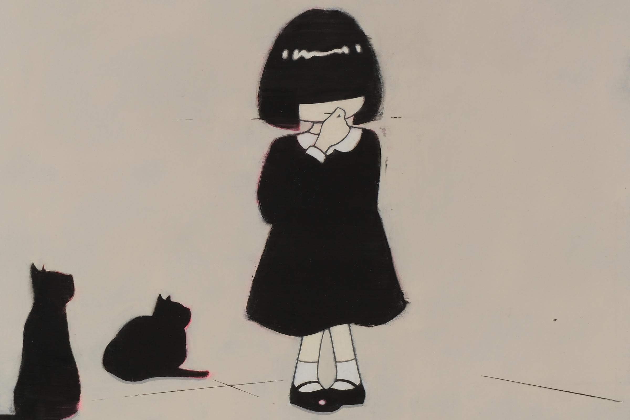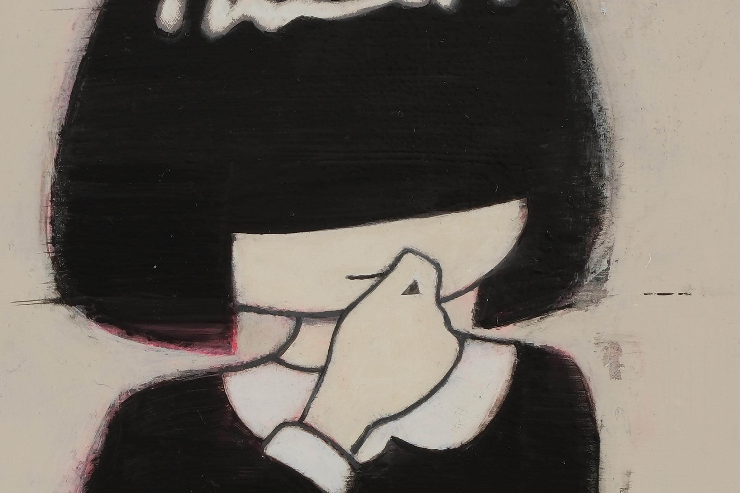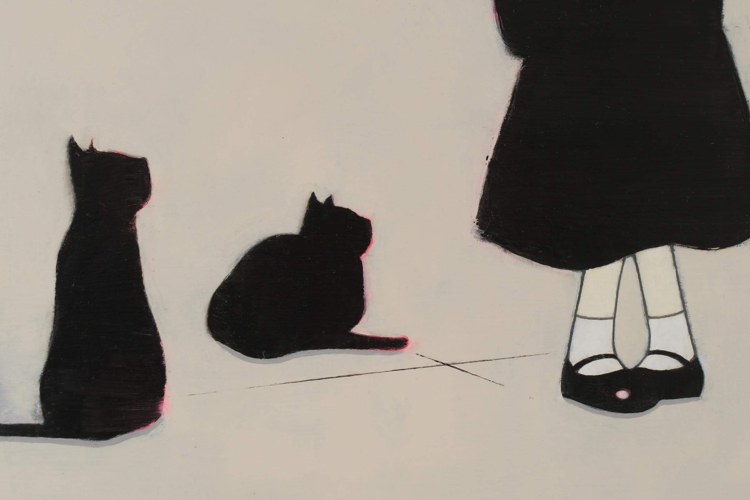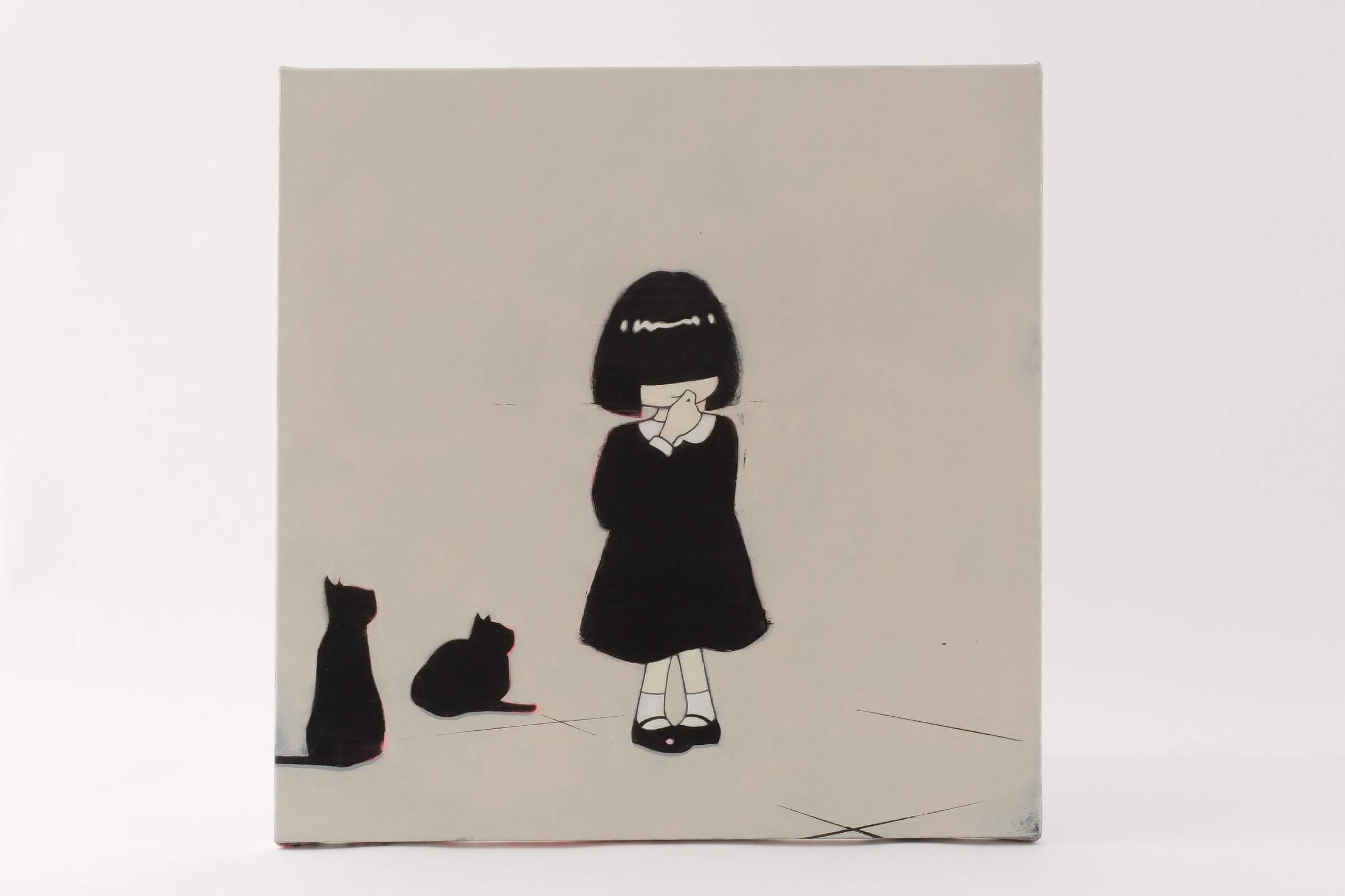 あまり好きではない部類の言葉なので困ってしまい、自分が許容できる「ウケる」のシチュエーションを考えました。女の子が小声で「ウケる」と言うくらいならと思い、普段は無口な女の子が笑ったシチュエーションを描きました。ミステリアスな感じを出そうと思い、それを猫に託しました。ところどころ絵具がはみ出たり飛び散ったりしている部分がありますが、これは、描いたり消したりを繰り返し、その過程で生じたミスや迷いの痕跡もなるべくそのまま残そうとしているためです。「ウケる」という題名でこの作品を見て、納得してもらえたら嬉しいです。