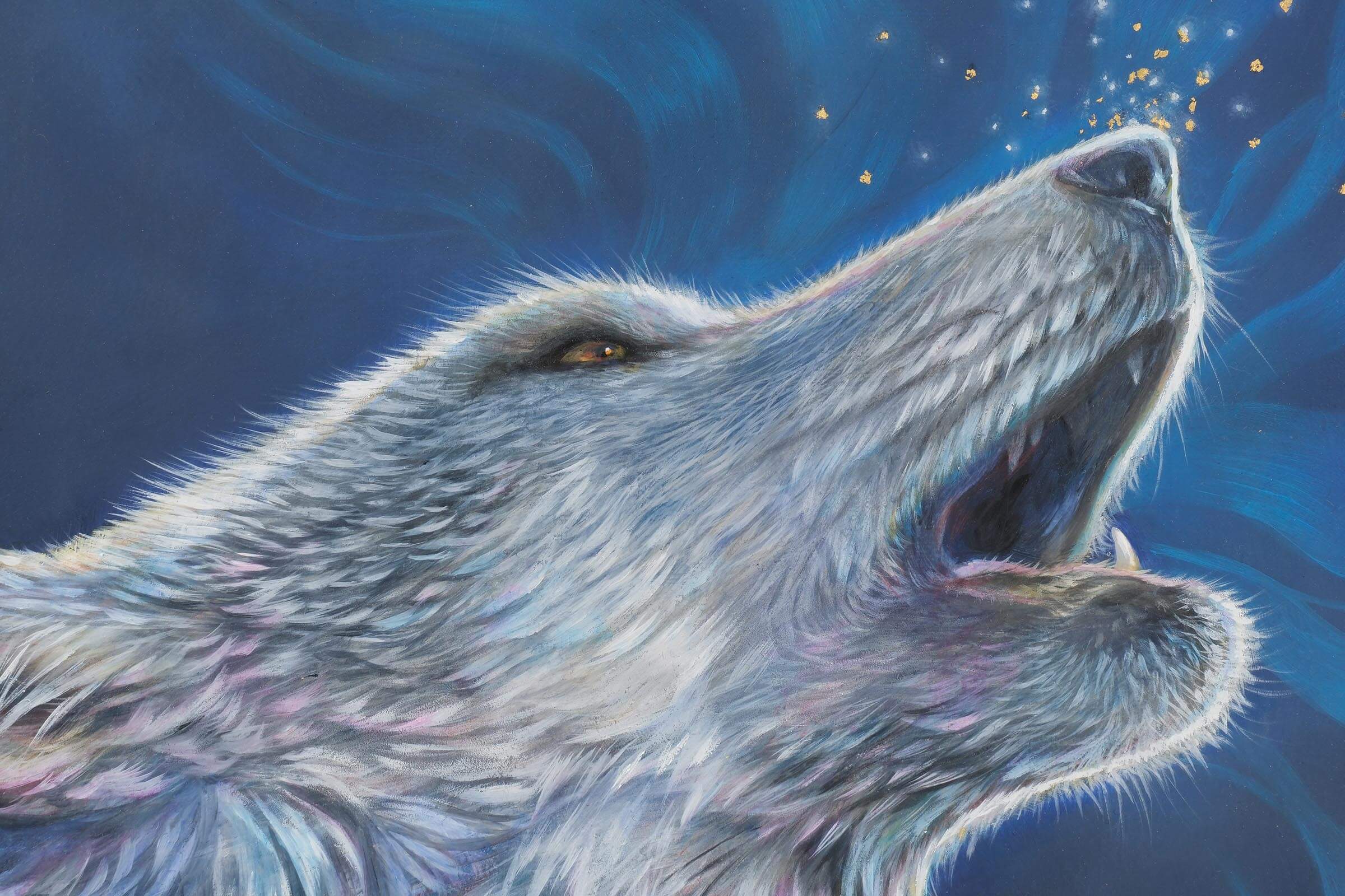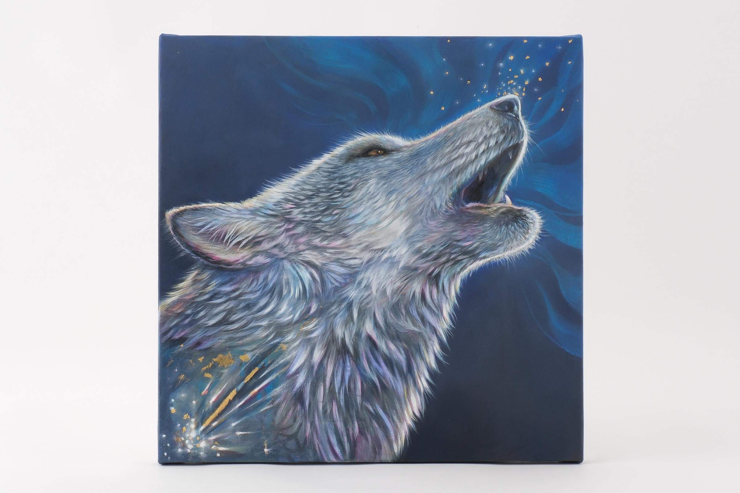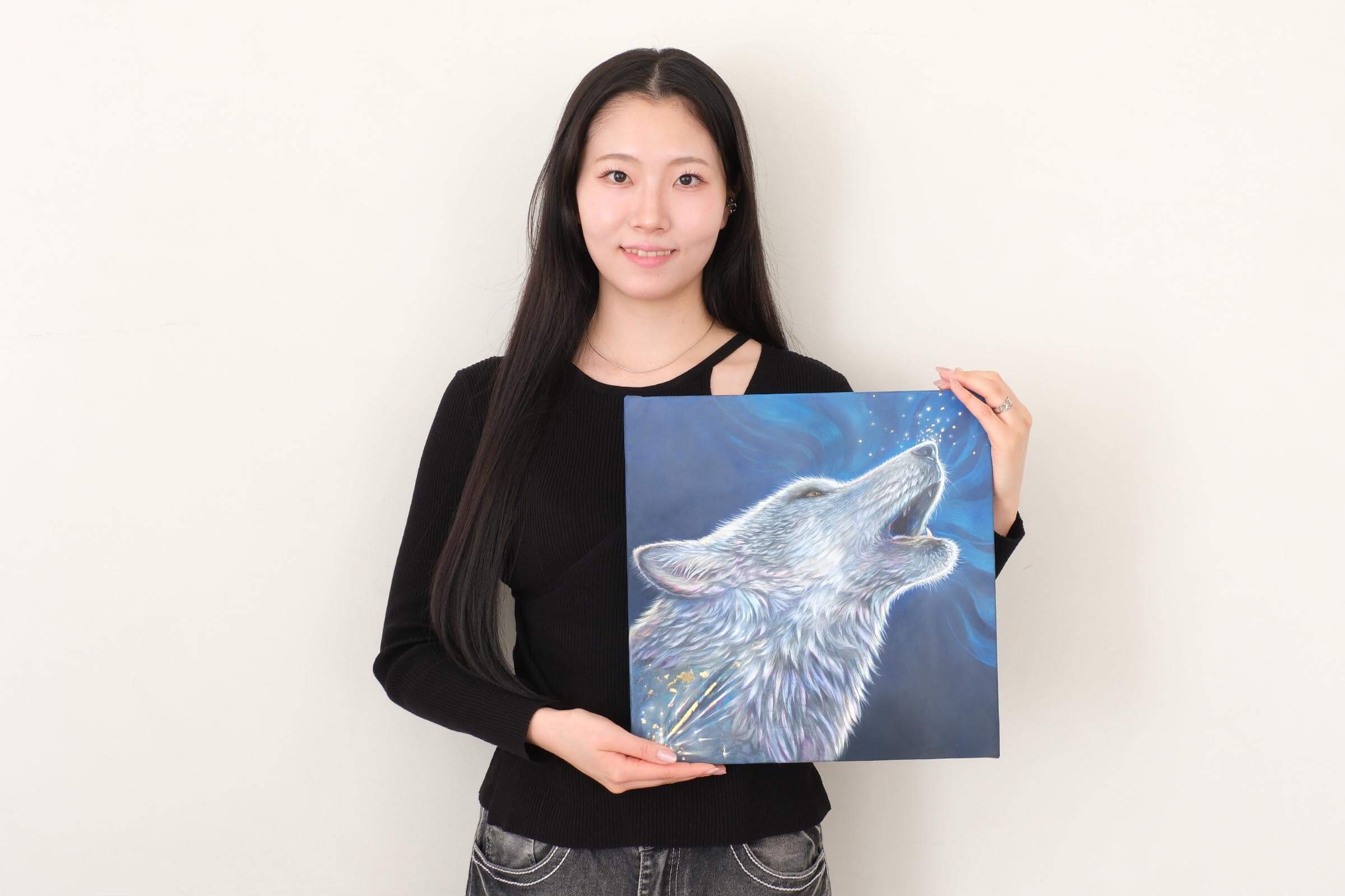 ふれ合ったことのない言葉でしたが、何かを伝えようとする思いとして捉えました。以前から狼の遠吠えを描きたくて、今回のテーマにピタっときたので、狼の身体から湧き出る思いを表現しました。私が描く色は身体の内側から生まれる色味をイメージしています。手前から狼の鼻先に向けてのエネルギーの動きも表現しました。最近は金箔を使った表現も取り入れているので、そのあたりも見てほしいです。