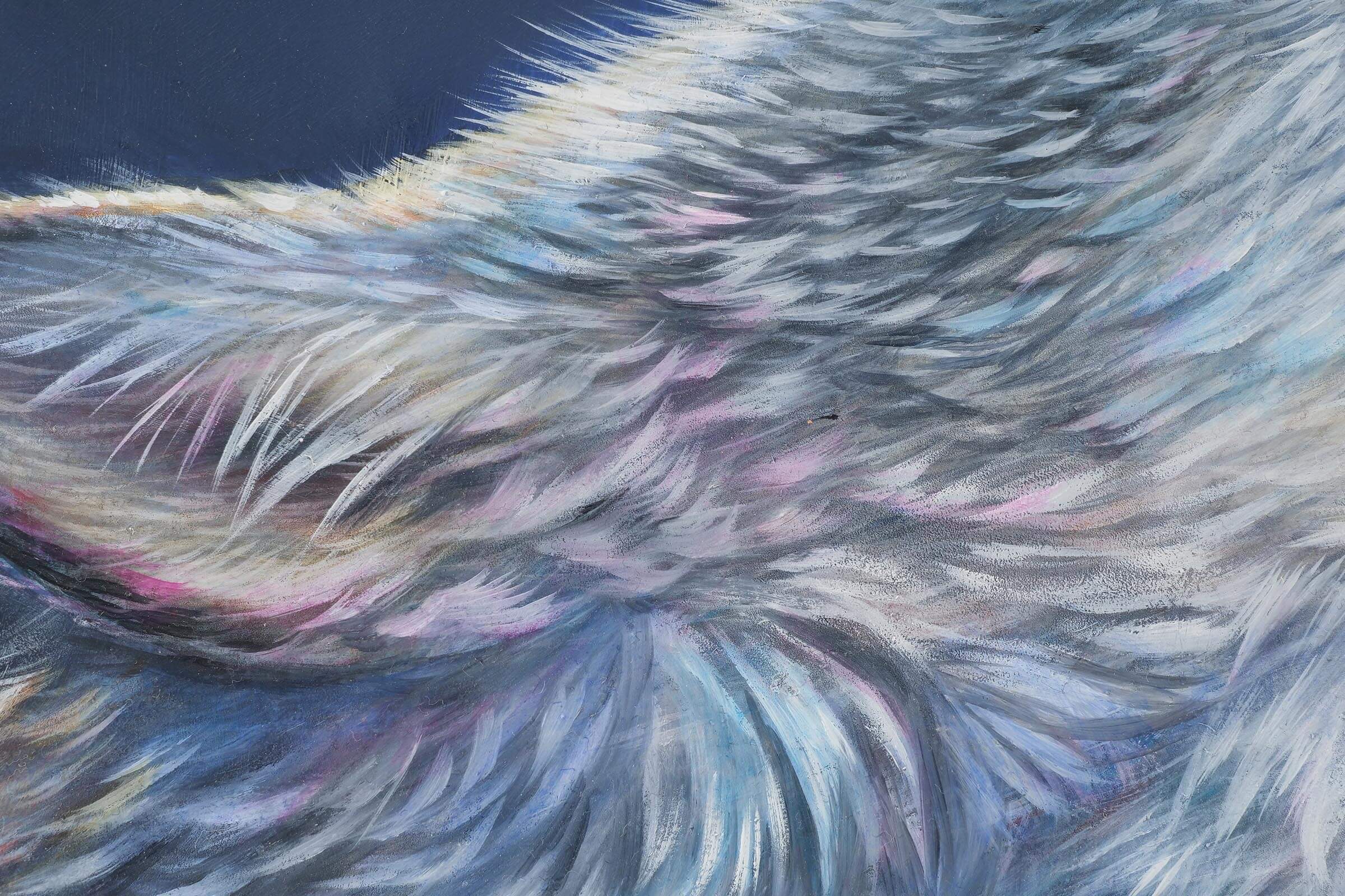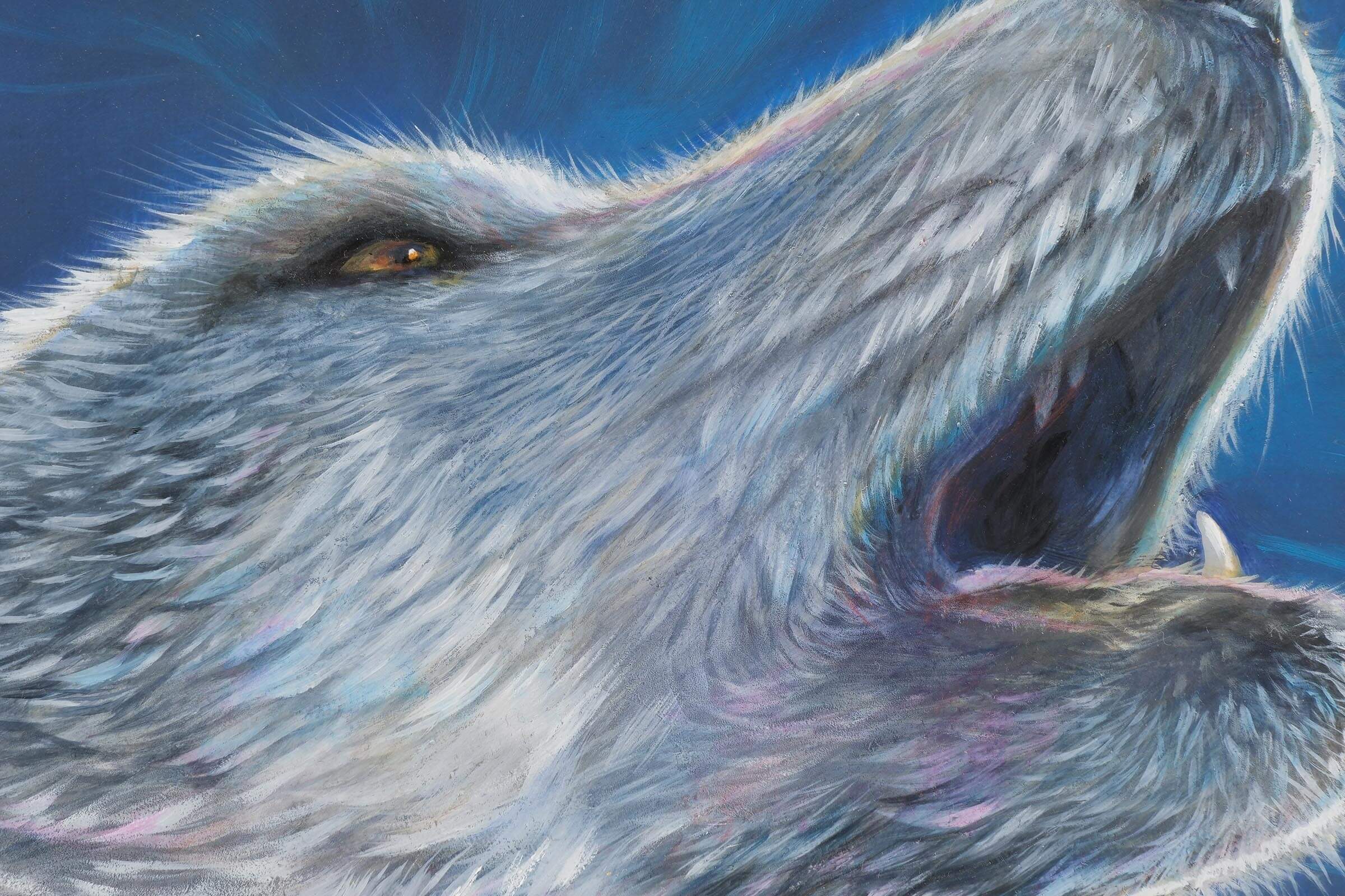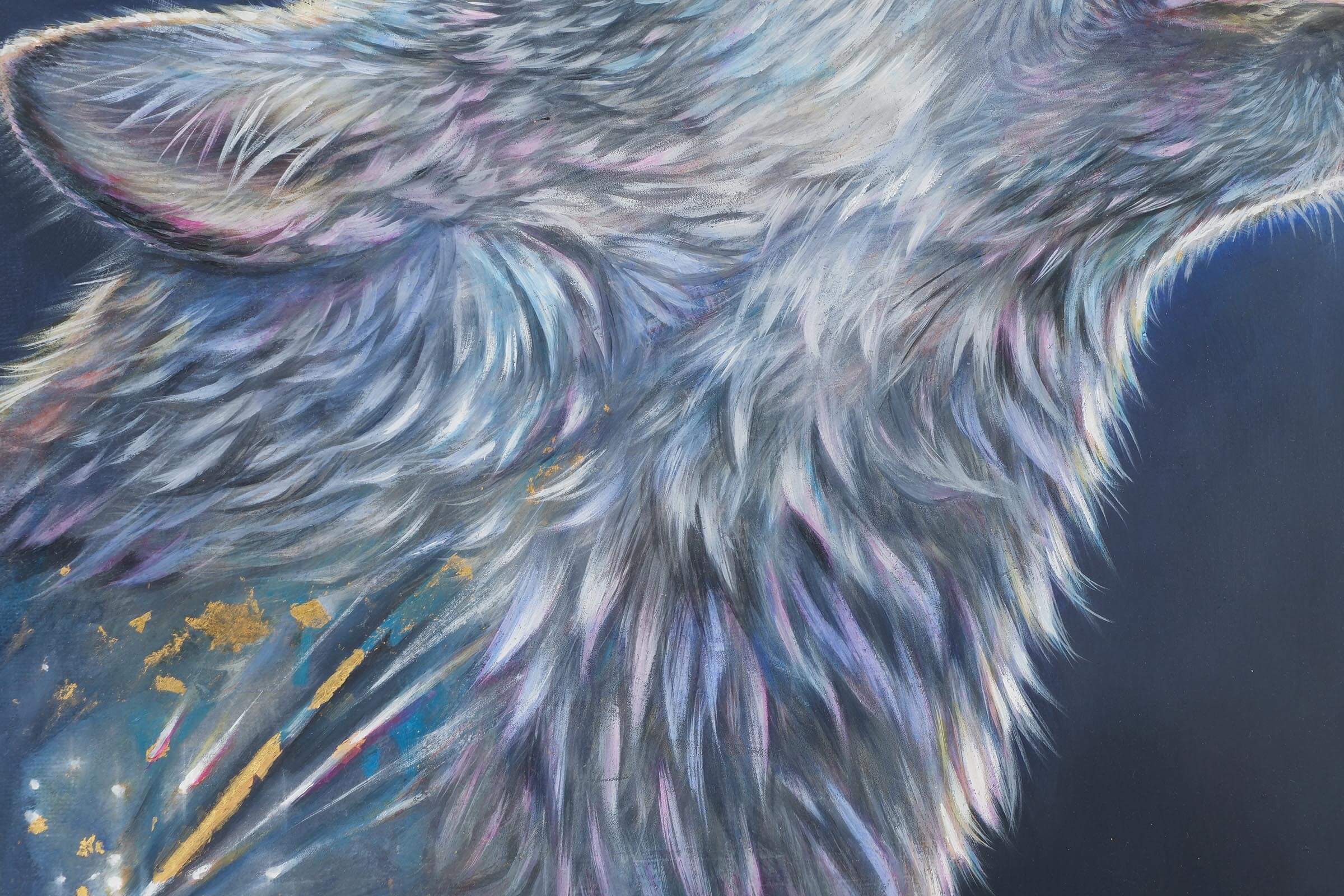 ふれ合ったことのない言葉でしたが、何かを伝えようとする思いとして捉えました。以前から狼の遠吠えを描きたくて、今回のテーマにピタっときたので、狼の身体から湧き出る思いを表現しました。私が描く色は身体の内側から生まれる色味をイメージしています。手前から狼の鼻先に向けてのエネルギーの動きも表現しました。最近は金箔を使った表現も取り入れているので、そのあたりも見てほしいです。